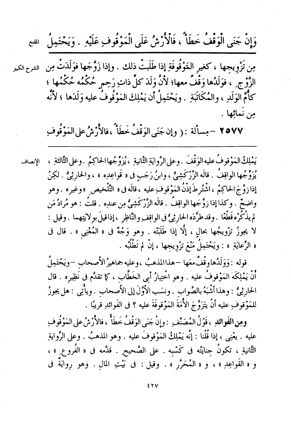 قوله: وَوَلَدُها وقْفٌ معَها -هذا المذهبُ، وعليه جماهيرُ الأصحابِ- ويَحْتَمِلُ أَنْ يَمْلِكَه المَوْقوفُ عليه. وهو اخْتِيارُ أبِي الخَطَّاب, كما تقدَّم في نَظيرِه. قال الحارِثيُّ: وهذا أشْبَهُ بالصَّوابِ. ونسَب الأوَّلَ إلى الأصَحابِ. ويأْتِي: هل يجوزُ للمَوْقوفِ عليه أنْ يتَزَوَّجَ الأَمَةَ المَوْقوفَةَ عليه؟ في الفَوائدِ قريبًا.