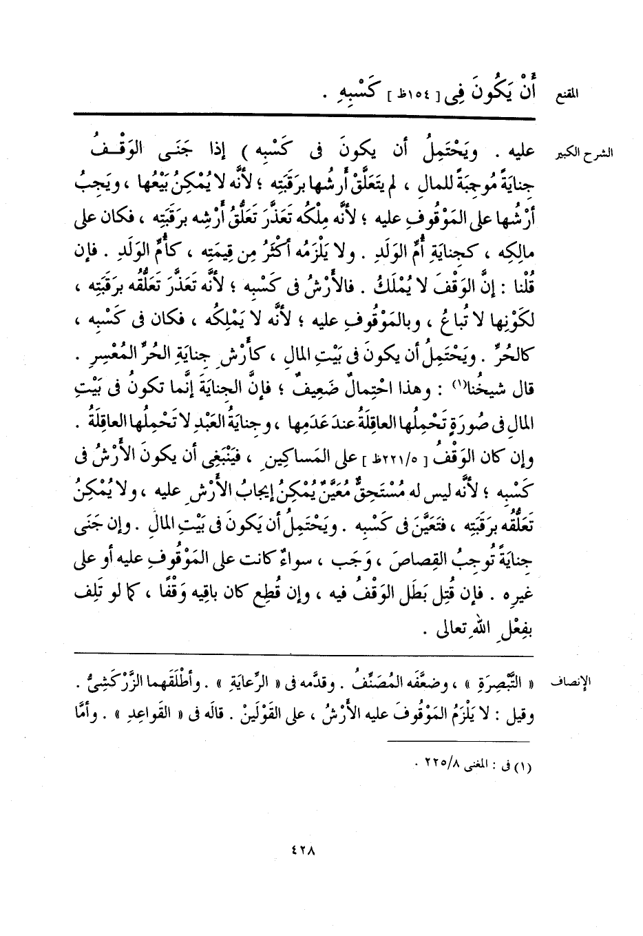 «التَّبْصِرَةِ»، وضعَّفَه المُصَنِّفُ. وقدَّمه في «الرِّعايَةِ». وأطْلَقَهما الزَّرْكَشِيُّ. وقيل: لا يَلْزَمُ المَوْقُوفَ عليه الأَرْشُ، على القَوْلَيْن. قاله في «القَواعِدِ». وأمَّا
