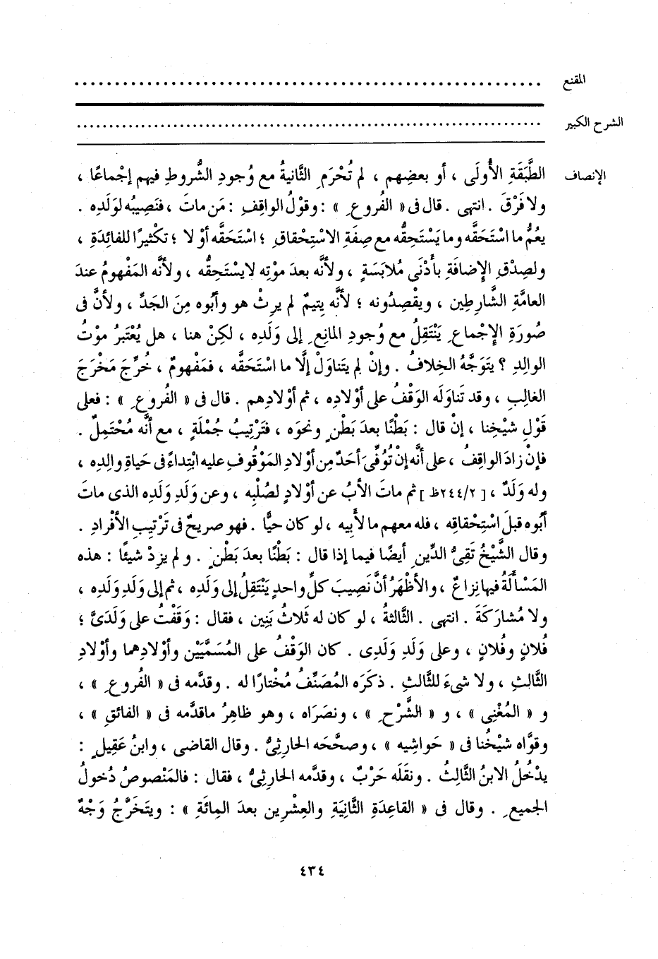 الطَّبَقَةِ الأُولَى، أو بعضِهم، لم تُحْرَمِ الثَّانيةُ مع وُجودِ الشُّروطِ فيهم إجْماعًا، ولا فَرْقَ. انتهى. قال في «الفُروعَ»: وقوْلُ الواقِفِ: مَن ماتَ، فنَصِيبُه لوَلَدِه. يعُمُّ ما اسْتَحَقَّه وما يَسْتَحِقُّه مع صِفَةِ الاسْتِحْقاقِ؛ اسْتَحَقَّه أوْ لا؛ تكْثيرًا للفائِدَةِ، ولصِدْقِ الإِضافَةِ بأدْنَى مُلابَسَةٍ، ولأنَّه بعدَ موْتِه لا يسْتَحِقُّه، ولأنَّه المَفْهومُ عندَ العامَّةِ الشَّارِطِين، ويقْصِدُونه؛ لأنَّه يِتيمٌ لم يرِثْ هو وأبُوه مِنَ الجَدِّ، ولأنَّ في صُورَةِ الإِجْماعِ يَنْتَقِلُ مع وُجودِ المانِعِ إلى وَلَدِه، لكِنْ هنا، هل يُعْتَبرُ موْتُ الوالِدِ؟ يتَوَجَّهُ الخِلافُ. وإنْ لم يتَناوَلْ إلَّا ما اسْتَحَقَّه، فمَفْهومٌ، خُرِّجَ مَخرَجَ الغالِبِ، وقد تَناوَلَه الوَقْفُ على أوْلادِه، ثم أوْلادَهم. قال في «الفُررعِ»: فعلى قَوْلِ شيخِنا، إنْ قال: بَطْنًا بعدَ بَطْنٍ ونحوَه، فتَرْتِيبُ جُمْلَةٍ، مع أنَّه مُحْتَمِلٌ. فإنْ زادَ الواقِفُ، على أنَّه إنْ تُوُفِّي أحَدٌ مِن أوْلادِ المَوْقوفِ عليه ابْتِداءً في حَياةِ والِدِه، وله وَلَدٌ، ثم ماتَ الأبُ عن أوْلادٍ لصُلْبه، وعن وَلَدِ وَلَدِه الذي ماتَ أبُوه قبل اسْتِحْقاقِه، فله معهم ما لأَبِيه، لو كان حيًّا. فهو صريحٌ في ترْتيِبِ الأفْرادِ. وقال الشَّيخُ تَقِيُّ الدِّينِ أيضًا فيما إذا قال: بَطْنًا بعدَ بَطْنٍ. ولم يزِدْ شيئًا: هذه المَسْأَلَةُ فيها نِزاعٌ، والأظْهَرُ أنَّ نَصِيبَ كلِّ واحدٍ يَنْتَقِلُ إلى وَلَدِه، ثم إلى وَلَدِ وَلَدِه، ولا مُشارَكَةَ. انتهى. الثَّالثةُ، لو كان له ثَلاثُ بَنِين، فقال: وَقَفْتُ على وَلَدَيَّ؛ فُلانٍ وفُلانٍ، وعلى وَلَدِ وَلَدِي. كان الوَقْفُ على المُسَمَّيَيْن وأوْلادِهما وأوْلادِ الثَّالثِ، ولا شيءَ للثَّالثِ. ذكَرَه المُصَنِّفُ مُخْتارًا له. وقدَّمه في «الفُروعِ»، و «المُغْنِي»، و «الشَّرْحِ»، ونصَرَاه، وهو ظاهِرُ ما قدَّمه في «الفائقِ»، وقوَّاه شيخُنا في «حَواشِيه»، وصحَّحَه الحارِثِيُّ. وقال القاضي، وابنُ عَقِيل: يدْخُلُ الابنُ الثَّالِثُ. ونقَلَه حَرْبٌ، وقدَّمه الحارِثِيُّ، فقال: فالمَنْصوصُ دُخولُ الجميعِ. وقال في «القاعِدَةِ الثَّانِيَةِ والعِشْرِين بعدَ المِائَةِ»: ويتَخَرَّجُ وَجْهٌ