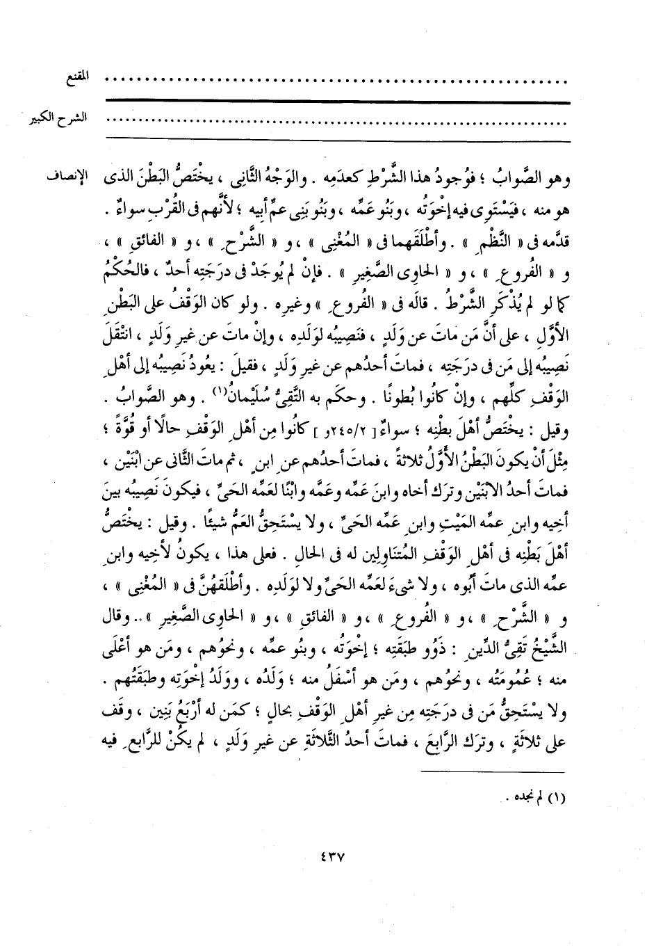 وهو الصَّوابُ؛ فوُجودُ هذا الشَّرْطِ كعدَمِه. والوَجْهُ الثَّانِي، يخْتَصُّ البَطْنَ الذي هو منه، فيَسْتَوي فيه إخْوَتُه، وبَنُو عَمِّه، وبَنُو بَنِي عمِّ أبِيه؛ لأنَّهم في القُرْبِ سواءٌ. قدَّمه في «النَّظْمِ». وأطْلَقَهما في «المُغْنِي»، و «الشَّرْحِ»، و «الفائقِ»، و «الفُروعِ»، و «الحاوي الصَّغِيرِ». فإنْ لم يُوجَدْ في درَجَتِه أحدٌ، فالحُكْمُ كما لو لم يُذكَرِ الشَّرْطُ. قاله في «الفُروعِ» وغيرِه. ولو كان الوَقْفُ على البَطْنِ الأوَّلِ، على أنَّ مَن فاتَ عن وَلَدٍ، فنَصِيبُه لوَلَدِه، وإنْ ماتَ عن غيرِ وَلَدٍ، انتْقَلَ نَصِيبُه إلى مَن في درَجَتِه، فماتَ أحدُهم عن غيرِ وَلَدٍ، فقيلَ: يعُودُ نَصِيبُه إلى أهْلِ الوَقْفِ كلِّهم، وإنْ كانُوا بُطونًا. وحكَم به التَّقِيُّ سُلَيمانُ (¬1). وهو الصَّوابُ. وقيل: يخْتَصُّ أهْلَ بطْنِه؛ سواءٌ كانُوا مِن أهْلِ الوَقْفِ حالًا أو قُوَّةً؛ مِثْلَ أنْ يكونَ البَطْنُ الأَوَّلُ ثلاثةً، فماتَ أحدُهم عنِ ابن، ثم ماتَ الثَّاني عن ابْنَين، فماتَ أحدُ الابنَين وترَك أخاه وابنَ عَمِّه وعَمَّه وابْنًا لعَمِّه الحَيِّ، فيكونَ نَصِيبُه بينَ أخِيه وابنِ عمِّه المَيتِ وابنِ عَمِّه الحَيِّ، ولا يسْتَحِقُّ العَمُّ شيئًا. وقيل: يخْتَصُّ أهْلَ بَطْنِه في أهْلِ الوَقْفِ المُتنَاولِين له في الحالِ. فعلى هذا، يكونُ لأخِيه وابنِ عمِّه الذي ماتَ أبُوه، ولا شيءَ لعَمِّه الحَيِّ ولا لوَلَدِه. وأطْلَقهُنَّ في «المُغْنِي»، و «الشَّرْحِ»، و «الفُروعِ»، و «الفائقِ»، و «الحاوي الصَّغِيرِ». وقال الشَّيخُ تَقِيُّ الدِّينِ: ذَوُو طبَقَتِه؛ إخْوَتُه، وبنُو عمِّه، ونحوُهم، ومَن هو أعْلَى منه؛ عُمُومَتُه، ونحوُهم، ومَن هو أسْفَلُ منه؛ وَلَدُه، ووَلَدُ إخْوَتِه وطبَقَتُهم. ولا يسْتَحِقُّ مَن في درَجَتِه مِن غيرِ أهْلِ الوَقْفِ بحالٍ؛ كمَن له أرْبَعُ بَنِين، وتَف على ثلاثَةٍ، وترَك الرَّابعَ، فماتَ أحدُ الثَّلاثَةِ عن غيرِ وَلَدٍ، لم يكُنْ للرَّابعِ فيه