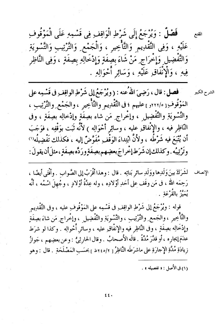 فَصْلٌ: وَيُرْجَعُ إِلَى شَرْطِ الْوَاقِفِ في قَسْمِهِ عَلَى الْمَوْقُوفِ عَلَيهِ، وَفِي التَّقْدِيمِ وَالتَّأْخِيرِ، وَالْجَمْعِ وَالتَّرْتِيبِ وَالتَّسْويَةِ وَالتَّفْضِيلِ وَإِخْرَاجِ مَنْ شَاءَ بِصِفَةٍ وَإِدْخَالِهِ بِصِفَةٍ، وَفِي النَّاظِرِ فِيهِ، وَالإِنْفَاقِ عَلَيهِ، وَسَائِرِ أَحْوَالِهِ.