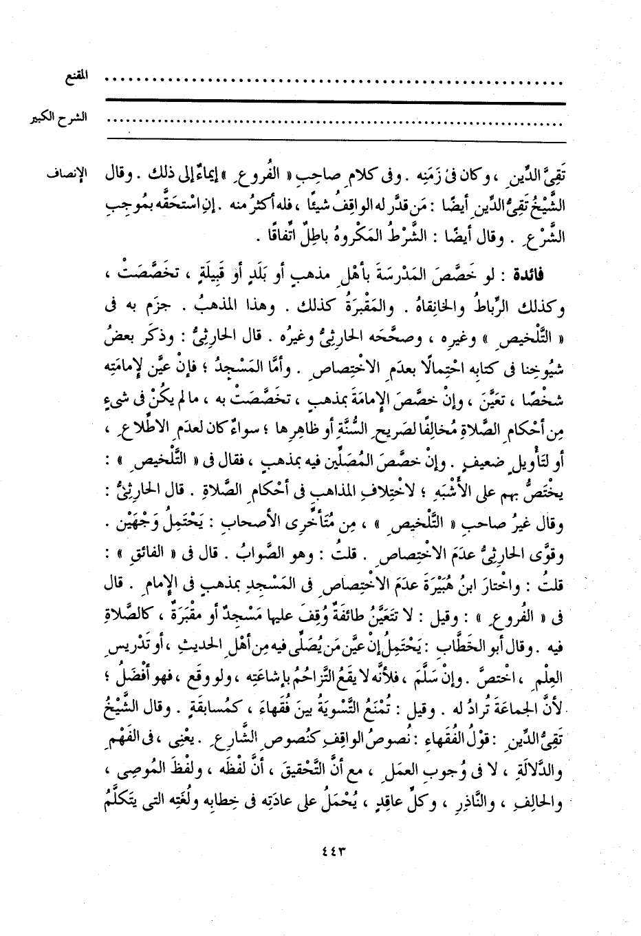 فائدة: لو خَصَّصَ المَدْرسَةَ بأهْلِ مذهبٍ أو بَلَدٍ أو قَبِيلَةٍ، تخَصَّصَتْ، وكذلك الرِّباطُ والخانِقاهُ. والمَقْبرَةُ كذلك. وهذا المذهبُ. جزَم به في «التَّلْخيصِ» وغيرِه، وصحَّحَه الحارِثِيُّ وغيرُه. قال الحارِثِيُّ: وذكَر بعضُ شيُوخِنا في كتابِه احْتِمالًا بعدَمِ الاخْتِصاصِ. وأمَّا المَسْجدُ؛ فإنْ عيَّن لإِمامَتِه شخْصًا، تعَيَّنَ، وإنْ خصَّصَ الإِمامَةَ بمذهبٍ، تخَصَّصَتْ به، ما لم يكُنْ في شيءٍ مِن أحْكامِ الصَّلاةِ مُخالِفًا لصَريحِ السُّنَّةِ أو ظاهِرِها؛ سواءٌ كان لعدَمِ الاطِّلاعِ، أو لتَأْويلٍ ضعيفٍ. وإنْ خصَّصَ المُصَلِّين فيه بمذهبٍ، فقال في «التَّلْخيصِ»: يخْتَصُّ بهم على الأَشْبَهِ؛ لاخْتِلافِ المذاهب في أحْكامِ الصَّلاةِ. قال الحارِثيُّ: وقال غيرُ صاحبِ «التَّلْخيصِ»، مِن مُتَأخِّرِي الأصحابِ: يَحْتَمِلُ وَجْهَين. وقوَّى الحارِثِيُّ عدَمَ الاخْتِصاصِ. قلتُ: وهو الصَّوابُ. قال في «الفائقِ»: قلتُ: واخْتارَ ابنُ هُبَيرَةَ عدَمَ الاخْتِصاصِ في المَسْجِدِ بمذهبٍ في الإِمامِ. قال في «الفُروعِ»: وقيل: لا تتَعَيَّنُ طائفَةٌ وُقِفَ عليها مَسْجِدٌ أو مقْبَرَةٌ، كالصَّلاةِ فيه. وقال أبو الخَطَّابِ: يَحْتَمِلُ إنْ عيَّن مَن يُصَلِّي فيه مِن أهْلِ الحديثِ، أو تَدْريس العِلْمِ، اخْتصَّ. وإنْ سَلَّمَ، فلأنَّه لا يقَعُ التَّزاحُمُ بإشاعَتِه، ولو وقَع، فهو أفْضَلُ؛ لأنَّ الجماعَةَ تُرادُ له. وقيل: تُمْنَعُ التَّسْويَةُ بينَ فُقَهاءَ، كمُسابقَةٍ. وقال الشَّيخُ تَقِيُّ الدِّينِ: قوْلُ الفُقَهاءِ: نُصوصُ الواقِفِ كنُصوصِ الشَّارِعِ. يعْنِي، في الفَهْمِ والدَّلالةِ، لا في وُجوبِ العمَلِ، مع أنَّ التَّحْقيقَ، أنَّ لفْظَه، ولفْظَ المُوصِي، والحالِفِ، والنَّاذِرِ، وكلِّ عاقِدٍ، يُحْمَلُ على عادَتِه في خِطابِه ولُغَتِه التي يتَكلَّمُ