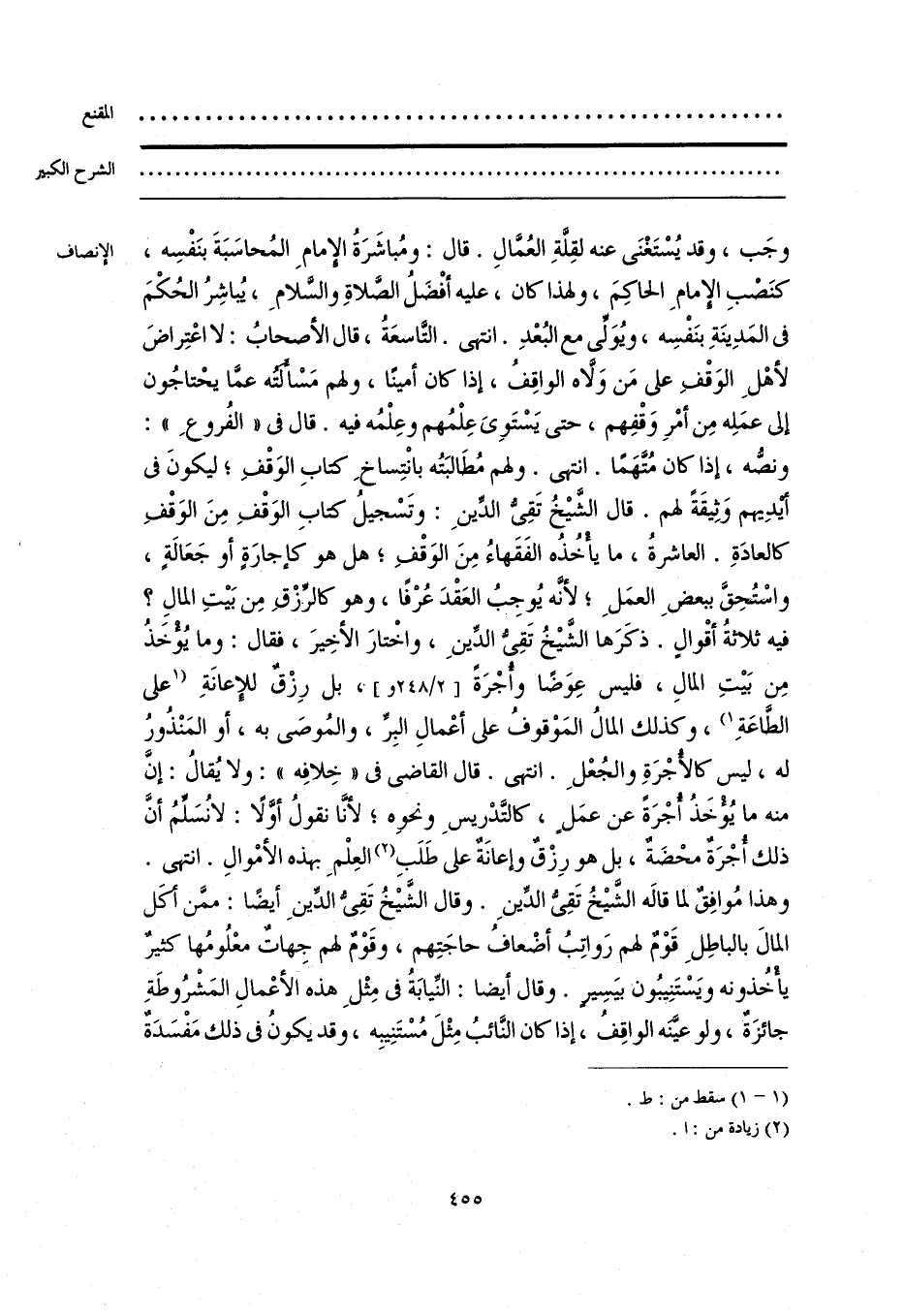 وجَب، وقد يُسْتَغْنَى عنه لقِلَّةِ العُمَّالِ. قال: ومُباشَرَةُ الإِمامِ المُحاسَبَةَ بنَفْسِه، كنَصْبِ الإِمامِ الحاكِمَ، ولهذا كان، عليه أفْضَلُ الصَّلاةِ والسَّلامِ، يُباشِرُ الحُكْمَ في المَدِينَةِ بنَفْسِه، ويُوَلِّي مع البُعْدِ. انتهى. التَّاسعَةُ، قال الأصحابُ: لا اعْتِراضَ لأهْلِ الوَقْفِ على مَن وَلَّاه الواقِفُ، إذا كان أمينًا، ولهم مَسْأَلَتُه عمَّا يحْتاجُون إلى عمَلِه مِن أمْرِ وَقْفِهم، حتى يَسْتَويَ عِلْمُهم وعِلْمُه فيه. قال في «الفُروعِ»: ونصُّه، إذا كان مُتَّهَمًا. انتهى. ولهم مُطَالبَتُه بانْتِساخِ كتابِ الوَقْفِ؛ ليكونَ في أيدِيهم وَثِيقَةً لهم. قال الشَّيخُ تَقِيُّ الدِّينِ: وتَسْجيلُ كتابِ الوَقْفِ مِنَ الوَقْفِ كالعادَةِ. العاشرةُ، ما يأْخُذُه الفَقَهاءُ مِنَ الوَقْفِ؛ هل هو كإِجارَةٍ أو جَعَالةٍ، واسْتُحِقَّ ببعضِ العمَلِ؛ لأنَّه يُوجِبُ العَقْدَ عُرْفًا، وهو كالرِّزْقِ مِن بَيتِ المالِ؟ فيه ثلاثةُ أقْوالٍ. ذكَرَها الشَّيخُ تَقِيُّ الدِّينِ، واخْتارَ الأخِيرَ، فقال: وما يُؤْخَذُ مِن بَيتِ المالِ، فليس عِوَضًا وأُجْرَةً، بل رِزْقٌ للإِعانَةِ [على الطَّاعَةِ] (¬1)، وكذلك المالُ المَوْقوفُ على أعْمالِ البِرِّ، والمُوصَى به، أو المَنْذُورُ له، ليس كالأُجْرَةِ والجُعْلِ. انتهى. قال القاضي في «خِلافِه»: ولا يُقالُ: إنَّ منه ما يُؤْخَذُ أجْرَةً عن عمَلٍ، كالتَّدْريسِ ونحوه؛ لأنَّا نقولُ أوَّلًا: لا نُسَلِّمُ أنَّ ذلك أُجْرَةٌ محْضَةٌ، بل هو رِزْقٌ وإعانَةٌ على طَلَبِ (¬2) العِلْمِ بهذه الأمْوالِ. انتهى. وهذا مُوافِقٌ لما قاله الشَّيخُ تَقِيُّ الدِّينِ. وقال الشَّيخُ تَقِيُّ الدِّينِ أيضًا: ممَّن أكَل المال بالباطِلِ قَوْمٌ لهم رَواتِبُ أضْعافُ حاجَتِهم، وقَوْمٌ لهم جِهاتٌ معْلُومُها كثيرٌ يأْخُذونه ويَسْتَنِيبُونْ بيَسِيرٍ. وقال أيضًا: النِّيابَةُ في مِثْلِ هذه الأعْمالِ المَشْرُوطَةِ جائزَةٌ، ولو عيَّنَه الواقِفُ، إذا كان النَّائبُ مِثْلَ مُسْتَنِيبِه، وقد يكونُ في ذلك مَفْسَدَةٌ