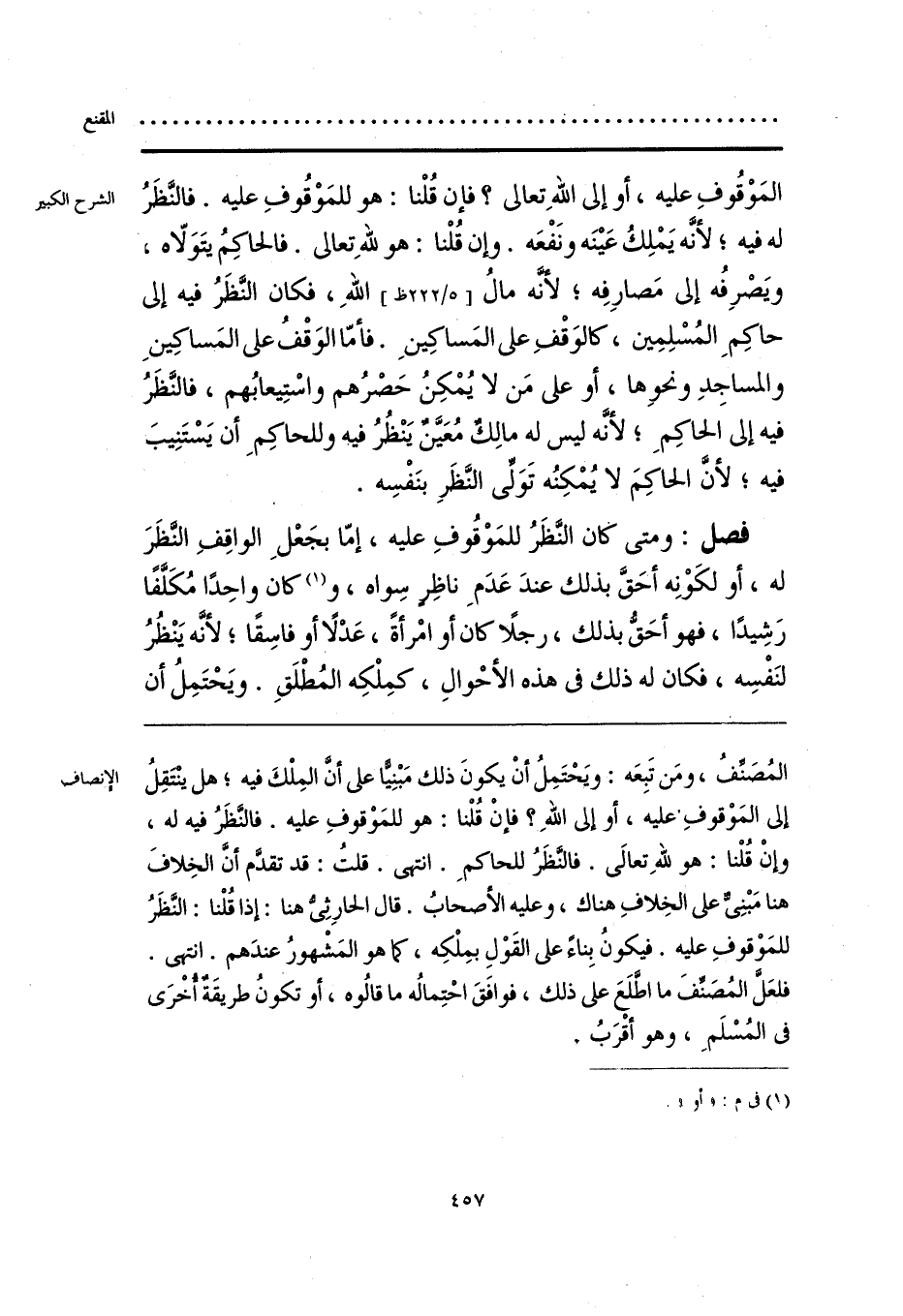 المُصَنِّفُ، ومَن تَبِعَه: ويَحْتَمِلُ أنْ يكونَ ذلك مَبْنِيًّا على أنَّ المِلْكَ فيه؛ هل ينْتَقِلُ إلى المَوْقوفِ. عليه، أو إلى اللهِ؟ فإنْ قُلْنا: هو للمَوْقوفِ عليه. فالنَّظرُ فيه له، وإنْ قُلْنا: هو للهِ تعالى. فالنَّظَرُ للحاكمِ. انتهى. قلتُ: قد تقدَّم أنَّ الخِلافَ هنا مَبْنِيٌّ على الخِلافِ هناك، وعليه الأصحابُ. قال الحارِثِيُّ هنا: إذا قُلْنا: النَّظَرُ للمَوْقوفِ عليه. فيكونُ بِناءً على القَوْلِ بمِلْكِه, كما هو المَشْهورُ عندَهم. انتهى. فلعَلَّ المُصَنِّفَ ما اطَّلَعَ على ذلك، فوافَقَ احْتِمالُه ما قالُوه، أو تكونُ طريقَةٌ أُخْرَى في المُسْلَمَ، وهو أقْرَبُ.