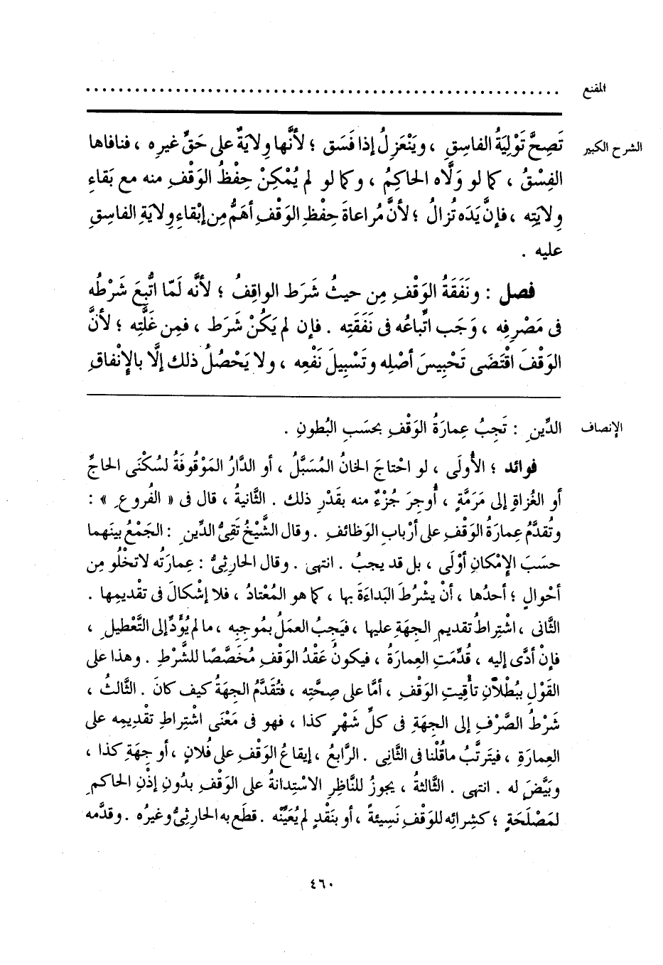 فوائد؛ الأُولَى، لو احْتاجَ الخانُ المُسَبَّلُ، أو الدَّارُ المَوْقُوفَةُ لسُكْنَى الحاجِّ أو الغُزاة إلى مَرَمَّةٍ، أُوجِرَ جُزْءٌ منه بقَدْرِ ذلك. الثَّانيةُ، قال في «الفُروعِ»: وتقدَّمُ عِمارَةُ الوَقْفِ على أرْبابِ الوَظائفِ. وقال الشَّيخُ تَقِيُّ الدِّينِ: الجَمْعُ بينَهما حسَبَ الإِمْكانِ أوْلَى، بل قد يجبُ. انتهى. وقال الحارِثِيُّ: عِمارَتُه لا تخْلُو مِن أحْوالٍ؛ أحدُها، أنْ يشْرُطَ البَداءَةَ بها, كما هو المُعْتادُ، فلا إشْكال في تقْديمِها. الثَّاني، اشْتِراطُ تقديمِ الجِهَةِ عليها، فيَجِبُ العمَلُ بمُوجِبِه، ما لم يُؤَدِّ إلى التَّعْطيلِ، فإنْ أدَّى إليه، قُدِّمَتِ العِمارَةُ، فيكونُ عَقْدُ الوَقْفِ مُخَصَّصًا للشَّرْطِ. وهذا على القَوْلِ ببُطْلانِ تأْقِيتِ الوَقْفِ، أمَّا على صِحَّتِه، فتُقَدَّمُ الجِهَةُ كيف كانَ. الثَّالثُ، شَرْطُ الصَّرْفِ إلى الجِهَةِ في كلِّ شَهْر كذا، فهو في مَعْنَى اشْتِراطِ تقْدِيمِه على العِمارَةِ، فيتَرتَّبُ ما قُلْنا في الثَّانِي. الرَّابعُ، إيقاعُ الوَقْفِ على فُلانٍ، أو جِهَةِ كذا، وبَيَّضَ له. انتهى. الثَّالثةُ، يجوزُ للنَّاظِرِ الاسْتِدْانةُ على الوَقْفِ بدُونِ إذْنِ الحاكمِ لمَصْلَحَةٍ؛ كشِرائِه للوَقْفِ نَسِيئةً، أو بنَقْدٍ لم يُعَيِّنْه. قطَع به الحارِثِيُّ وغيرُه. وقدَّمه