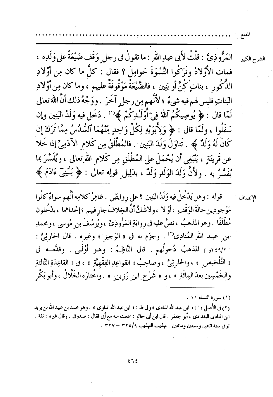 قوله: وهل يَدْخُلُ فيه وَلَدُ البَنِين؟ على رِوايتَين. ظاهِرُ كلامِه أنَّهم سواءٌ كانُوا مَوْجودَين حالةَ الوَقْفِ، أوْ لا، ولا شَكَّ أنَّ الخِلافَ جارٍ فيهم؛ إحْداهما، يدْخُلون مُطْلَقًا. وهو المذهبُ، نصَّ عليه في رِوايَةِ المَرُّوذِيِّ، ويُوسُفَ بنِ مُوسى، ومحمدِ بنِ عبيد اللهِ المُنادِي (¬1). وجزَم به في «الوَجيزِ» وغيرِه. قال الحارِثِيُّ: المذهبُ دُخولُهم. قال النَّاظِمُ: وهو أوْلَى. وقدَّمه في «التَّلْخيصِ»، والحارِثِي، وصاحِبُ «القواعِدِ الفِقْهِيَّةِ»، في «القاعِدَةِ الثَّالثةِ والخَمْسِين بعدَ المِائَةِ»، و «شَرْحِ ابنِ رَزِينٍ». واخْتارَه الخَلَّالُ، وأبو بَكْرٍ