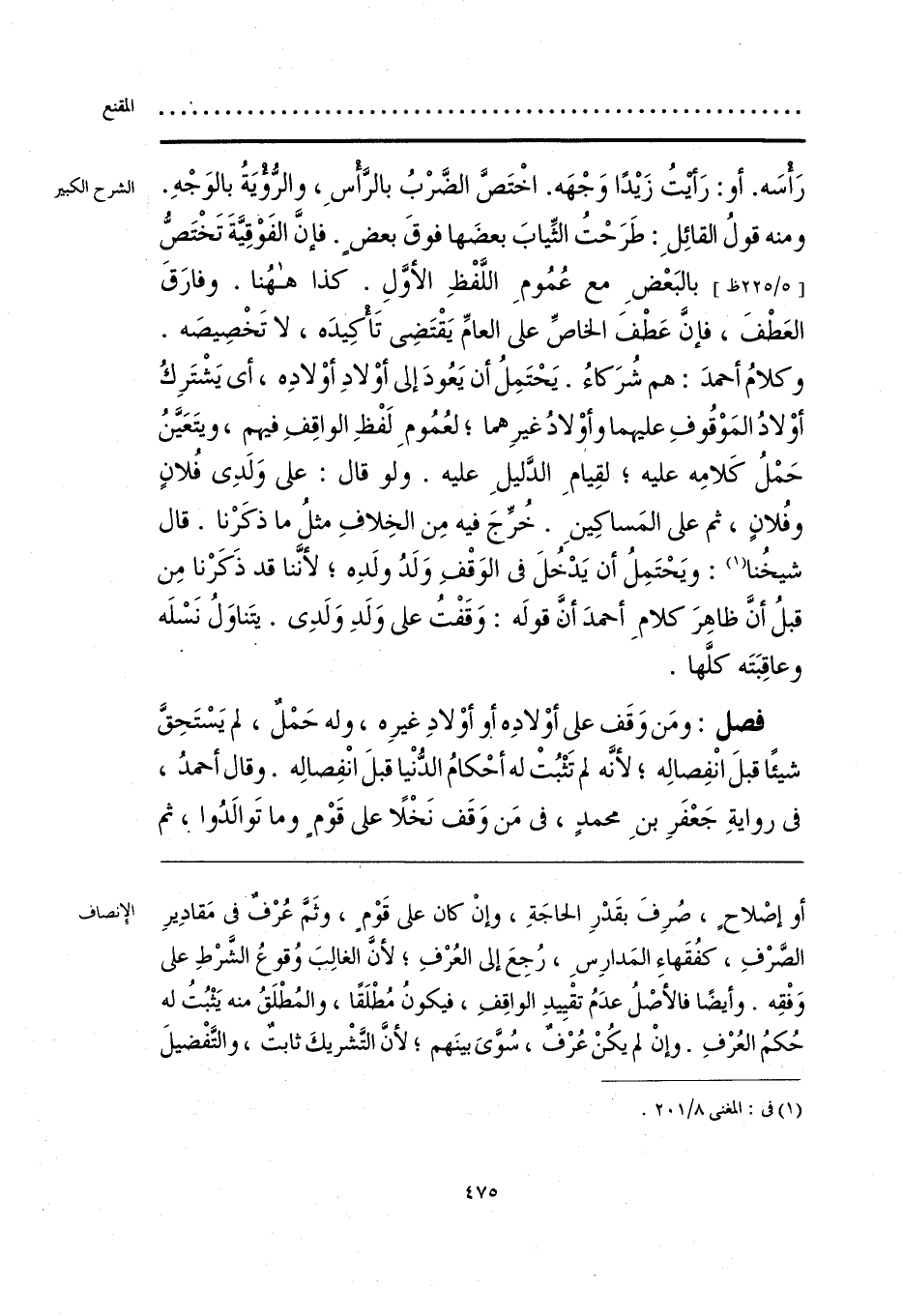 أو إصْلاحٍ، صُرِفَ بقَدْرِ الحاجَةِ، وإنْ كان على قَوْمٍ، وثَمَّ عُرْفٌ في مَقادِيرِ الصَّرْفِ، كفُقَهاء المَدارِسِ، رُجِعَ إلى العُرْفِ؛ لأنَّ الغالِبَ وُقوعُ الشَّرْطِ على وَفْقِه. وأيضًا فالأصلُ عدَمُ تقْيِيدِ الواقِفِ، فيكونُ مُطْلَقًا، والمُطْلَقُ منه يَثْبُتُ له حُكمُ العُرْفِ. وإنْ لم يكُنْ عُرْفٌ، سُوَّىَ بينَهم؛ لأنَّ التَّشْريكَ ثابتٌ، والتَّفْضيلَ