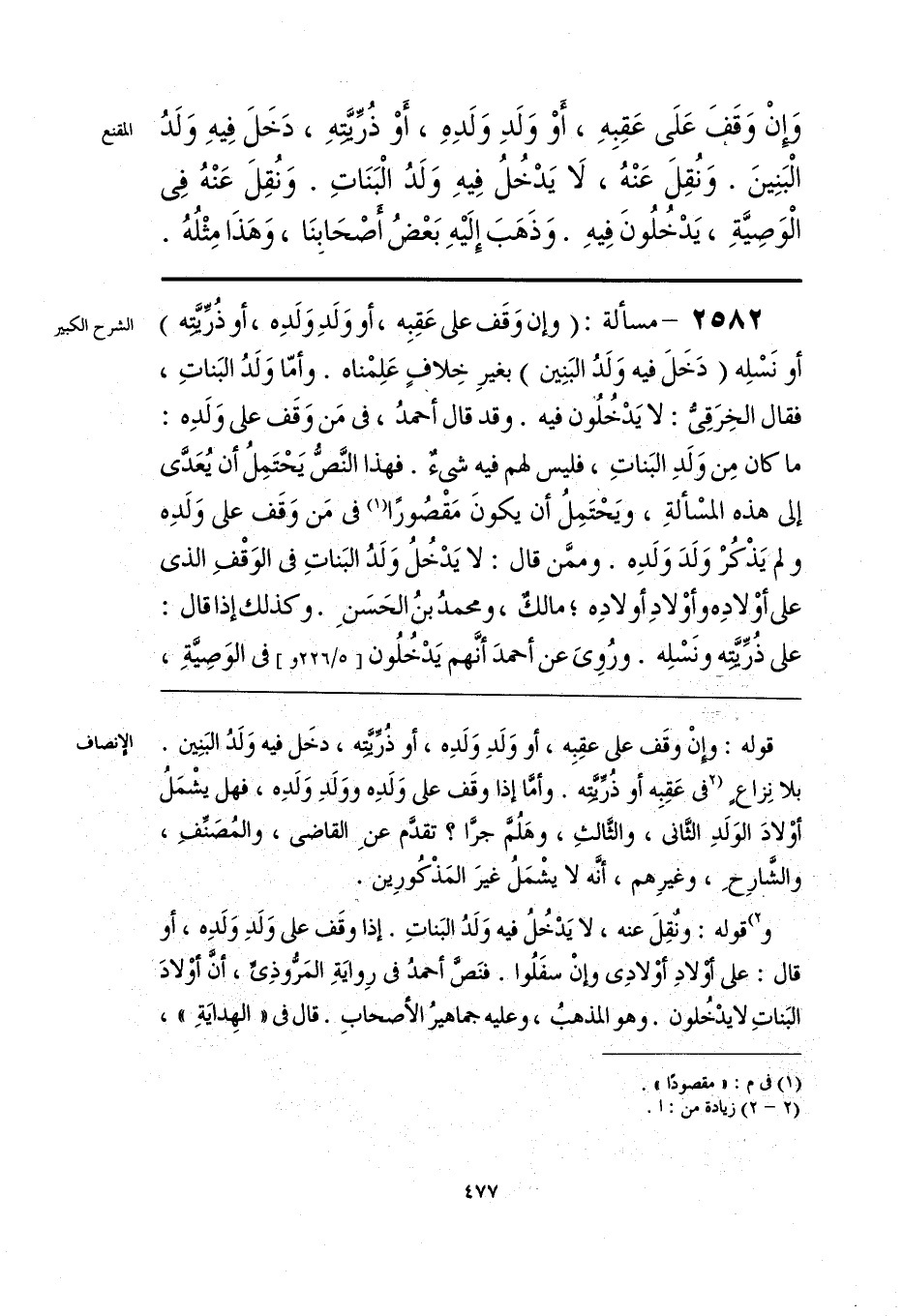 قوله: وإِنْ وقَف على عقِبِه، أو وَلَدِ وَلَدِه، أو ذُرِّيَّتِه، دخَل فيه وَلَدُ البَنِين. بلا نِزاعٍ [في عَقِبِه أو ذُرِّيَّتِه. وأمَّا إذا وقَف على وَلَدِه ووَلَدِ وَلَدِه، فهل يشْمَلُ أوْلادَ الوَلَدِ الثَّاني، والثَّالثِ، وهَلُمَّ جرَّا؟ تقدَّم عنِ القاضي، والمُصَنِّفِ، والشَّارِحِ، وغيرِهم، أنَّه لا يشْمَلُ غيرَ المَذْكُورِين.