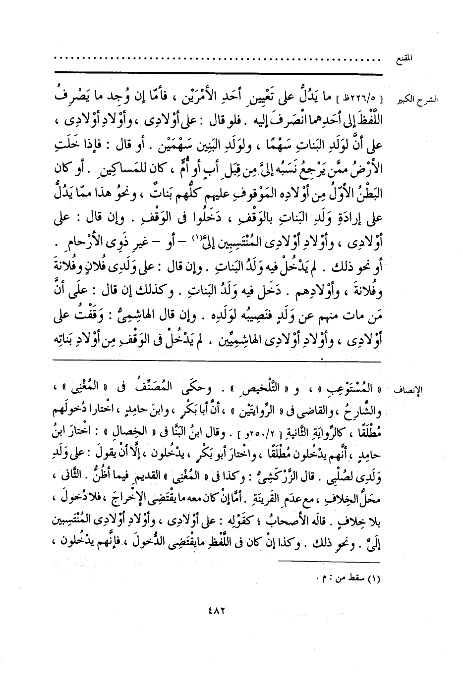 «المُسْتَوْعِبِ»، و «التَّلْخيصِ». وحكَى المُصَنِّفُ في «المُغْنِي»، والشَّارِحُ، والقاضي في «الرِّوايتَين»، أنَّ أبا بَكْرٍ، وابنَ حامِدٍ، اخْتارا دُخولَهم مُطْلَقًا، كالرِّوايَةِ الثَّانيةِ. وقال ابنُ البَنَّا في «الخِصالِ»: اخْتارَ ابنُ حامِدٍ، أنَّهم يدْخُلون مُطْلَقًا، واخْتارَ أبو بَكْرٍ، يدْخُلون، إلَّا أنْ يقولَ: على وَلَدِ وَلَدِي لصُلْبِي. قال الزَّرْكشِيُّ: وكذا في «المُغْنِي» القديمِ فيما أظُنُّ. الثَّاني، محَلُّ الخِلافِ، مع عدَمِ القَرينَةِ. أمَّا إنْ كان معه ما يقْتَضِي الإِخْراجَ، فلا دُخولَ، بلا خِلافٍ. قاله الأصحابُ؛ كقَوْلِه: على أوْلادِي، وأوْلادِ أوْلادِي المُنْتسِبين إلَيَّ. ونحو ذلك. وكذا إنْ كان في اللَّفْظِ ما يقتَضِي الدُّخولَ،. فإنَّهم يدْخُلون،