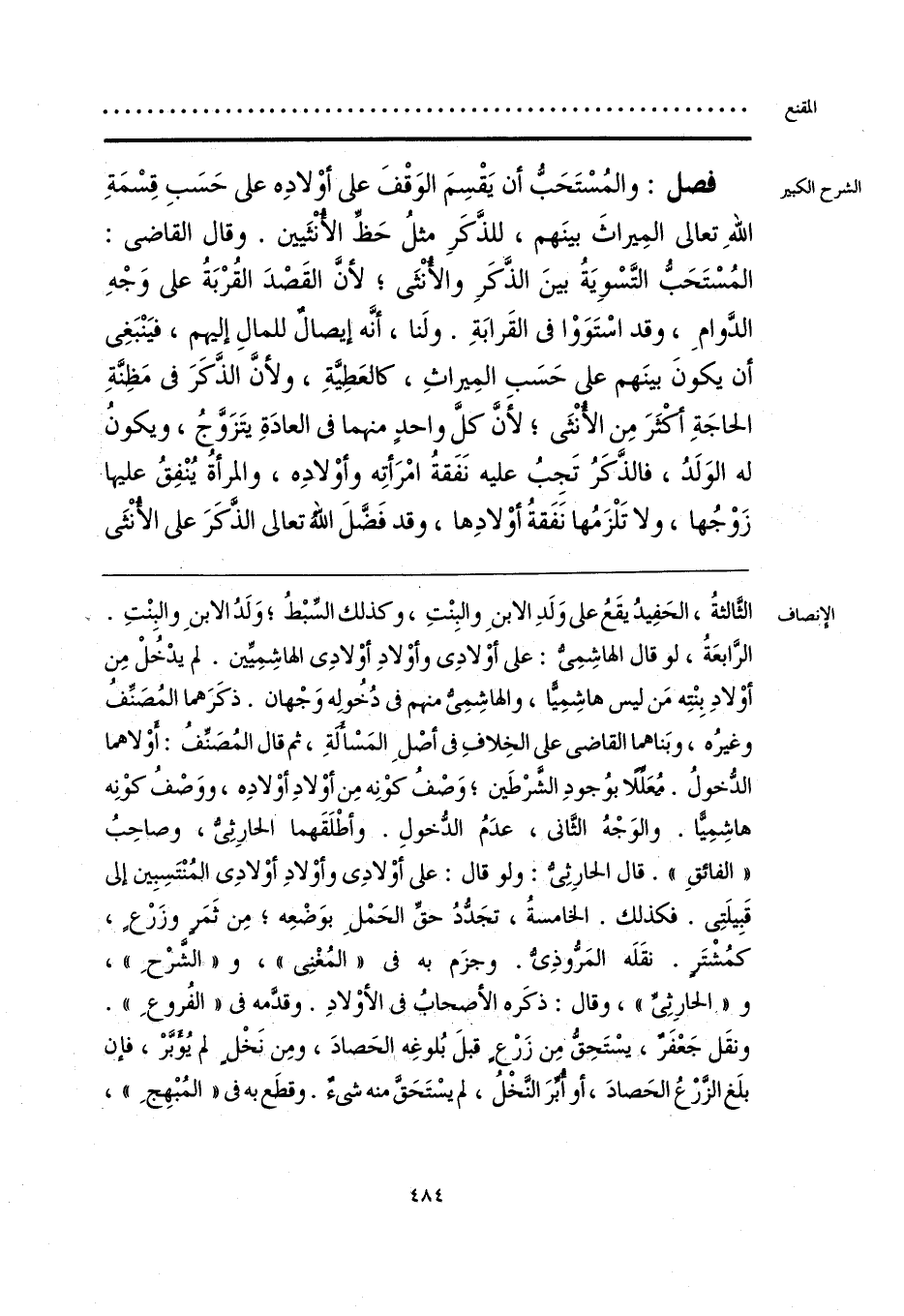 الثَّالثةُ، الحَفِيدُ يقَعُ على وَلَدِ الابنِ والبِنْتِ، وكذلك السِّبْطُ؛ وَلَدُ الابنِ والبِنْتِ. الرَّابعَةُ، لو قال الهاشِمِيُّ: على أوْلادِي وأوْلادِ أوْلادِي الهاشِمِيِّين. لم يدْخُلْ مِن أوْلادِ بِنْتِه مَن ليس هاشِمِيًّا، والهاشِمِيُّ منهم في دُخولِه وَجْهان. ذكَرَهما المُصَنِّفُ وغيرُه، وبَناهما القاضي على الخِلافِ في أصْلِ المَسْأَلَةِ، ثم قال المُصَنِّفُ: أَوْلاهما الدُّخولُ. مُعَلِّلًا بوُجودِ الشَّرْطَين؛ وَصْفُ كوْنِه مِن أوْلادِ أوْلادَه، ووَصْفُ كوْنِه هاشِمِيًّا. والوَجْهُ الثَّاني، عدَمُ الدُّخولِ. وأطْلَقَهما الحارِثِيُّ، وصاحِبُ «الفائقِ». قال الحارِثِيُّ: ولو قال: على أوْلادِي وأوْلادِ أوْلادِي المُنْتَسِبِين إلى قَبِيلَتِي. فكذلك. الخامسةُ، تجَدُّدُ حقِّ الحَمْلِ بوَضْعِه؛ مِن ثَمَرٍ وزَرْعٍ، كمُشْتَرٍ. نقَلَه المَرُّوذِيُّ. وجزَم به في «المُغْنِي»، و «الشَّرْحِ»، و «الحارِثِيِّ»، وقال: ذكَره الأصحابُ في الأوْلادِ. وقدَّمه في «الفُروعِ». ونقَل جَعْفَرٌ، يسْتَحِقُّ مِن زَرْعٍ قبلَ بُلوغِه الحَصادَ، ومِن نَخْلٍ لم يُؤَبَّرْ، فإن بلَغ الزَّرْعُ الحَصادَ، أو أُبِّرَ النَّخْلُ، لم يسْتَحَقَّ منه شئٌ. وقطَع به في «المُبْهِجِ»،