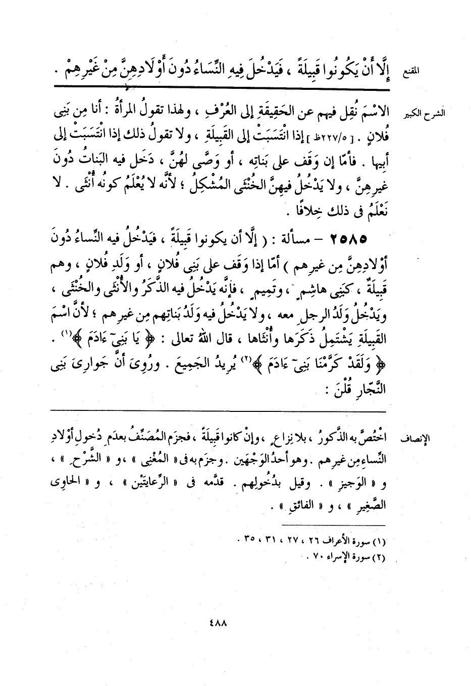 اختُصَّ به المذكورُ، بلا نِزاعٍ، وإنْ كانوا قَبِيلَةً، فجزَم المُصَنِّفُ بعدَمِ دُخولِ أوْلادِ النِّساءِ مِن غيرِهم. وهو أحدُ الوَجْهَين. وجزَم به في «المُغْني»، و «الشَّرْحِ»، و «الوَجيزِ». وقيل بدُخُولِهم. قدَّمه في «الرِّعايتَين»، و «الحاوي الصَّغِيرِ»، و «الفائقِ».