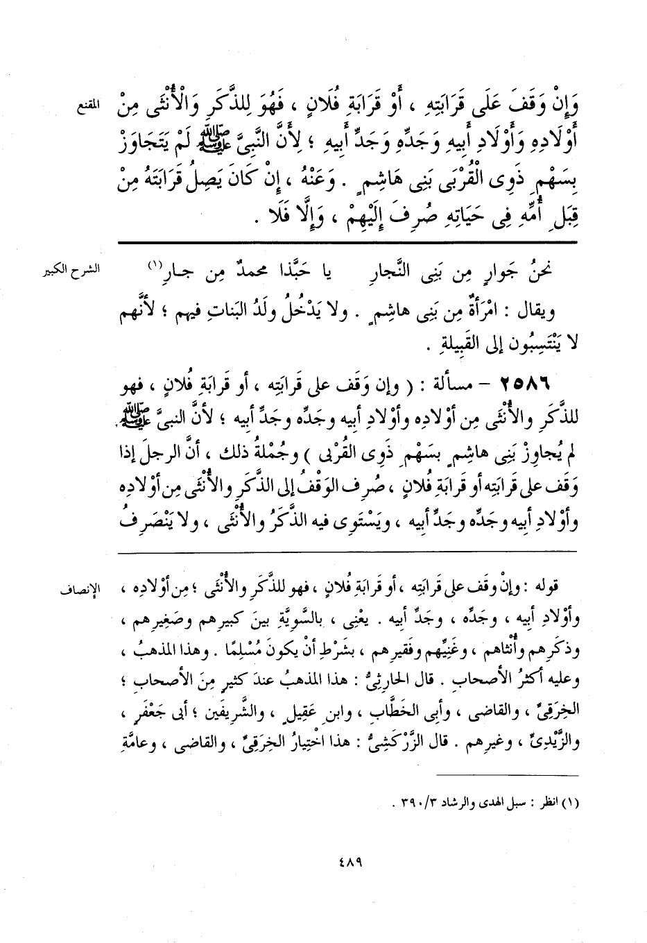 قوله: وإنْ وقَف على قَرابَتِه، أو قَرابَةِ فُلانٍ، فهو للذَّكَرِ والأُنْثَى؛ مِن أوْلادِه، وأوْلادِ أبِيه، وجَدِّه، وجَدِّ أبِيه. يعْنِي، بالسَّويَّةِ بينَ كبيرِهم وصَغِيرِهم، وذكَرِهم وأُنْثَاهم، وغَنِيِّهم وفَقيرِهم، بشَرْطِ أنْ يكونَ مُسْلِمًا. وهذا المذهبُ، وعليه أَكْثَرُ الأصحابِ. قال الحارِثِيُّ: هذا المذهبُ عندَ كثيرٍ مِنَ الأصحابِ؛ الخِرَقِيِّ، والقاضي، وأبِي الخَطَّابِ، وابنِ عَقِيلٍ، والشَّرِيفَين؛ أبي جَعْفَرٍ، والزَّيدِيِّ، وغيرِهم. قال الزَّرْكَشِيُّ: هذا اخْتِيارُ الخِرَقِيِّ، والقاضي، وعامَّةِ