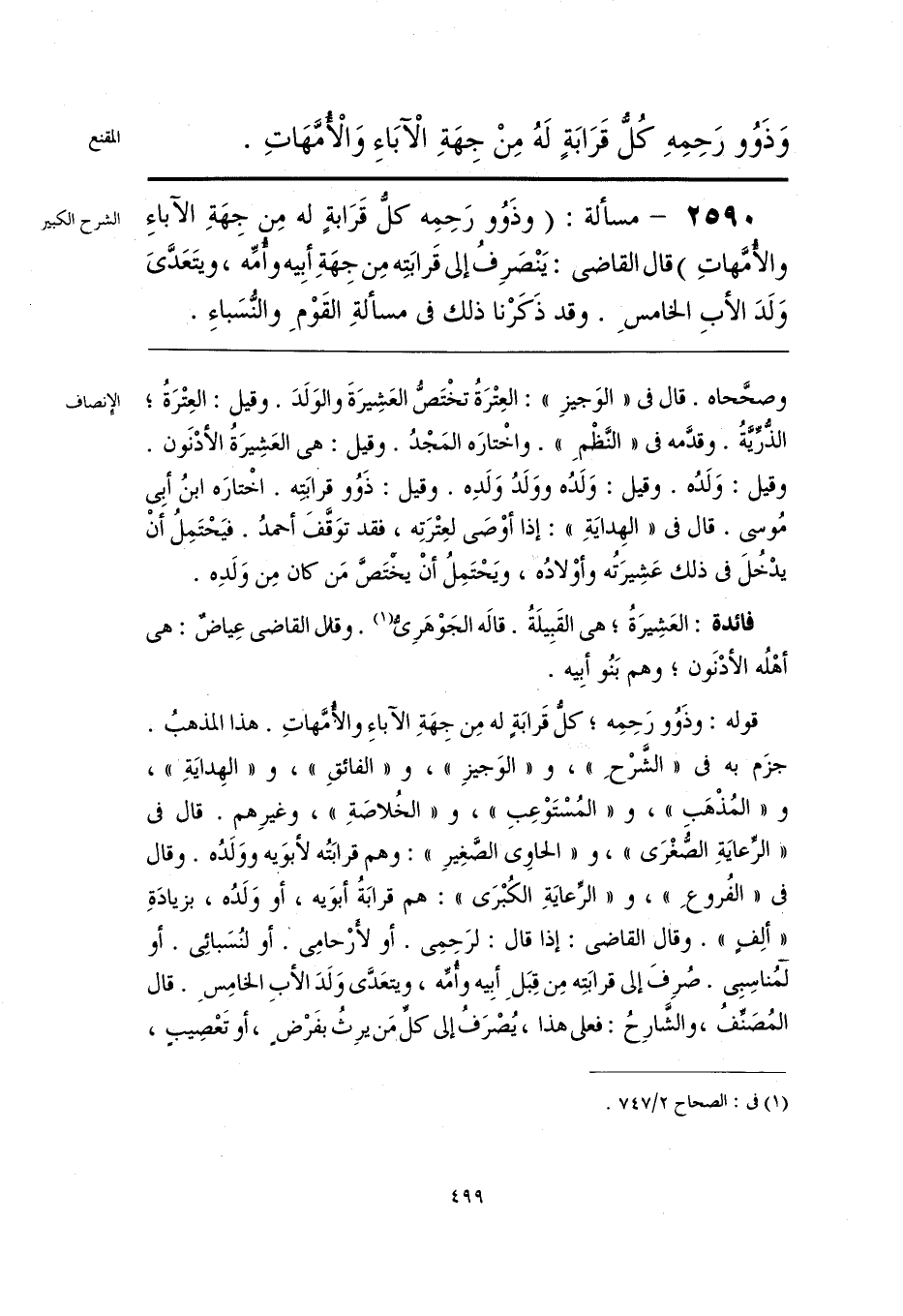 قوله: وذَوُو رَحِمِه؛ كلُّ قَرابَةٍ له مِن جِهَةِ الآباءِ والأُمهاتِ. هذا المذهبُ. جزَم به في «الشَّرْحِ»، و «الوَجيزِ»، و «الفائقِ»، و «الهِدايَةِ»، و «المُذْهَب»، و «المُسْتَوْعِبِ»، و «الخُلاصَةِ»، وغيرِهم. قال في «الرِّعايَةِ الصُّغْرَى»، و «الحاوي الصَّغِيرِ»: وهم قرابَتُه لأبوَيه ووَلَدُه. وقال في «الفُروعِ»، و «الرِّعايَةِ الكُبْرَى»: هم قرابَةُ أبوَيه، أو وَلَدُه، بزيادَة «ألِفٍ». وقال القاضي: إذا قال: لرَحِمِي. أو لأرْحامِي. أو لنُسَبائِي. أوَ لمُناسِبِي. صُرِفَ إلى قرابَتِه مِن قِبَلِ أبِيه وأُمِّه، ويتعَدَّى وَلَدَ الأبِ الخامِسِ. قال المُصَنِّفُ، والشَّارِحُ: فعلى هذا، يُصْرَفُ إلى كلِّ مَن يرِثُ بفَرْض، أو تَعْصِيبٍ،