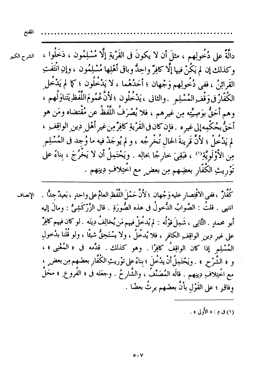 كُفَارٌ، ففي الاقْتِصارِ عليه وَجْهان؛ لأنَّ حَمْلَ اللَّفْظِ العامْ على واحدٍ، بَعيدٌ جِدًّا. انتهى. قلتُ: الصَّوابُ الدُّخولُ في هذه الصُّورَةِ. قال الزَّرْكَشِيُّ: ومال إليه أبو محمدٍ. الثانِي، شَمِلَ قوْلُه: لم يدخُلْ فيهم مَن يُخالِفُ دِينَه. لو كان فيهم كافِرٌ على غيرِ دِينِ الواقِفِ الكافرِ، فلا يدخُلُ، ولا يسْتَحِق شيئًا، ولو قُلْنا بدُخولِ المُسْلِمِ إذا كان الواقِفُ كافِرًا. وهو كذلك. قدَّمه في «المُغْنِي»، و «الشَّرْحِ». ويَحْتَمِلُ أنْ يدْخُلَ؛ بِناءً على توْريثِ الكُفَارِ بعضَهم مِن بعض، مع اخْتِلافِ دِيِنِهم. قاله المُصَنِّفُ، والشَّارِحُ. وجعَله في «الفُروعِ» محَلَّ وفاقٍ؛ على القَوْلِ بأنَّ بعضَهم يرِثُ بعضًا.