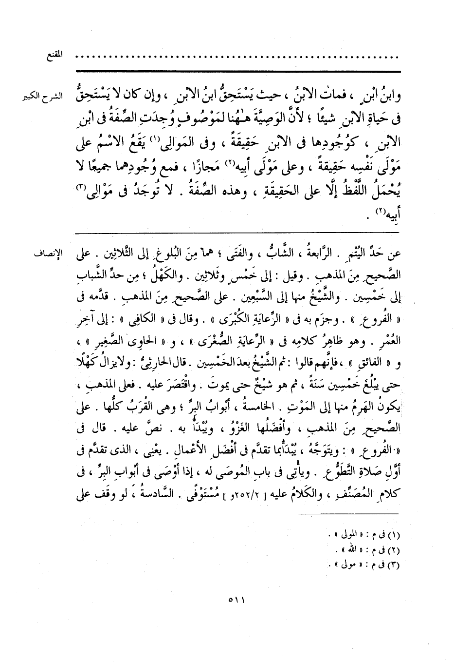 عن حَدِّ اليُتْمِ. الرَّابعةُ، الشَّابُّ، والفَتَى؛ هما مِنَ البُلوغِ إلى الثَّلاثِين. على الصَّحيحِ مِنَ المذهبِ. وقيل: إلى خَمْس وثَلاثين. والكَهْلُ؛ مِن حدِّ الشَّبابِ إلى خَمْسِين. والشَّيخُ منها إلى السَّبْعِين. على الصَّحيحِ مِنَ المذهبِ. قدَّمه في «الفُروعِ». وجزَم به في «الرِّعايَةِ الكُبْرَى». وقال في «الكافِي»: إلى آخِرِ العُمْرِ. وهو ظاهِرُ كلامِه في «الرِّعايَةِ الصُّغْرَى»، و «الحاوي الصَّغِيرِ»، و «الفائقِ»، فإنَهم قالوا: ثم الشَّيخُ بعدَ الخَمْسِين. قال الحارِثِيُّ: ولا يزالُ كَهْلًا حتَّى يبْلُغ خَمْسِين سَنَةً، ثم هو شيخ حتَّى يموتَ اقْتَصَرَ عليه. فعلى المذهبِ، يكونُ الهَرِمُ منها إلى المَوْتِ. الخامسةُ، أَبْوابُ البِرِّ؛ وهي القُرَبُ كلُّها. على الصَّحيحِ مِنَ المذهبِ، وأفْضَلُها الغَزْوُ، ويُبْدَأُ به. نصَّ عليه. قال في «الفُروعِ»: ويتَوَجَّهُ، يُبْدَأُ بما تقدَّم في أفْضَلِ الأعْمَالِ. يعْنِي، الَّذي تقدَّم في أَوَّلِ صَلاةِ التَّطَوُّعِ. ويأتِي في بابِ المُوصَى له، إذا أوْصَى في أَبْوابِ البِرِّ، في كلامِ المُصَنِّفِ، والكَلامُ عليه مُسْتَوْفًى. السَّادسةُ، لو وقَف على