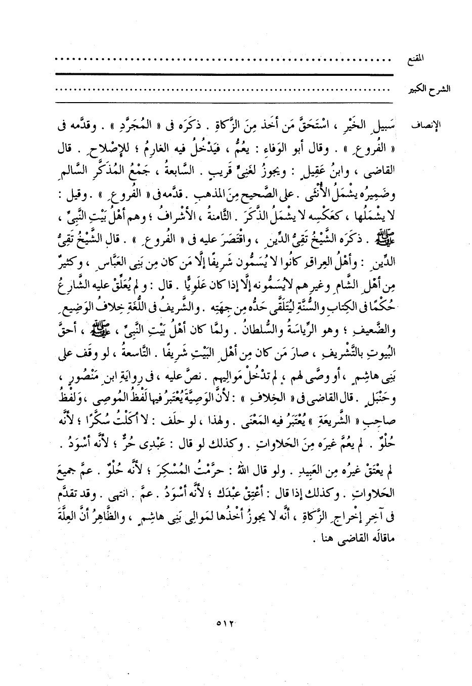 سَبيلِ الخَيرِ، اسْتَحَقَّ مَن أخَذ مِنَ الزَّكاةِ. ذكَرَه في «المُجَرَّدِ». وقدَّمه في «الفُروعِ». وقال أبو الوَفاءِ: يعُمُّ، فيَدْخُلُ فيه الغارِمُ؛ للإصْلاحِ. قال القاضي، وابنُ عَقِيلٍ: ويجوزُ لغَنِيٍّ قَريبٍ. السَّابعةُ، جَمْعُ المُذَكَّرِ السَّالمِ وضَمِيرُه يشْمَلُ الأْنثَى. على الصحيح مِنَ المذهبِ. قدَّمه في «الفُروعِ». وقيل: لا يشْمَلُها، كعَكْسِه لا يشْمَلُ الذَّكَرَ. الثَّامنةُ، الأشْرافُ؛ وهم أهْل بَيتِ النَّبِيِّ، - صلى الله عليه وسلم - ذكَرَه الشَّيخُ تَقِيُّ الدِّينِ، واقْتَصَرَ عليه في «الفُروعِ». قال الشَّيخُ تَقِيُّ الدِّينِ: وأهْلُ العِراقِ كانُوا لا يُسَمُّون شَرِيفًا إلَّا مَن كان مِن بَنِي العَبَّاسِ، وكثيرٌ مِن أَهْلِ الشَّامِ وغيرِهم لا يسَمُّونه إلَّا إذا كان عَلَويًّا. قال: ولم يُعَلِّقْ عليه الشَّارِعُ حُكْمًا في الكِتابِ والسُّنَّةِ ليُتَلَقَّى حَدُّه مِن جِهَتِه. والشَّريفُ في اللُّغَةِ خِلافُ الوَضِيعِ والضَّعيفِ؛ وهو الرِّياسَةُ والسُّلطانُ. ولمَّا كان أهْلُ بَيتِ النَّبِيِّ، - صلى الله عليه وسلم -، أحقَّ البُيوتِ بالتَّشْريفِ، صارَ مَن كان مِن أهْلِ البَيتِ شَرِيفًا. التَّاسعةُ، لو وقَف على بَنِي هاشِمٍ، أو وصَّى لهم؛ لم تدْخُلْ مَوالِيهم. نصَّ عليه، في رِوايَةِ ابنِ مَنْصُورٍ، وحَنْبَل. قال القاضي في «الخِلافِ»: لأنَّ الوَصِيَّةَ يُعْتَبرُ فيها لَفْظُ المُوصِي، وَلفْظُ صاحِبِ «الشَّريعَةِ» يُعْتَبَرُ فيه المَعْنَى. ولهذا، لو حلَف: لا أكَلْتُ سُكَرًا؛ لأنَّه حُلْوٌ. لم يعُمَّ غيرَه مِنَ الحَلاواتِ. وكذلك لو قال: عَبْدِي حُرٌّ؛ لأنَّه أسْوَدُ. لم يعْتَقْ غيرُه مِن العَبِيدِ. ولو قال اللهُ: حرَّمْتُ المُسْكِرَ؛ لأنَّه حُلْوٌ. عمَّ جميعَ الحَلاواتِ. وكذلك إذا قال: أعْتِقْ عبْدَك؛ لأنَّه أسْوَدُ. عمَّ. انتهى. وقد تقدَّم في آخِرِ إخْراجِ الزَّكاةِ، أنَّه لا يجوزُ أخْذُها لمَوالِي بَنِي هاشِمٍ، والظَّاهِرُ أنَّ العِلَّةَ ما قاله القاضي هنا.