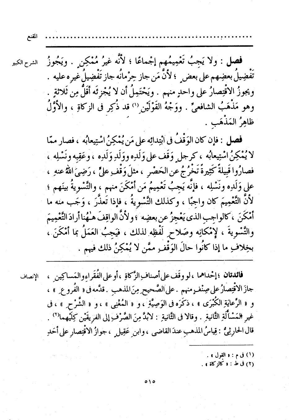 فائدتان؛ إحْداهما، لو وقَف على أصنافِ الزَّكاةِ، أو على الفُقَراءِ والمَساكِينِ، جازَ الاقْتِصارُ على صِنْفٍ منهم. على الصَّحِيحِ مِنَ المذهبِ. قدَّمه في «الفُروعِ»، و «الرِّعايَةِ الكُبْرَى»، ذكَرَه في الوَصِيَّةِ، و «المُغْنِي»، و «الشَّرْحِ»، في غيرِ المَسْأَلَةِ الثَّانيةِ. وقالا في الثَّانيةِ: لابُدَّ مِنَ الصَّرْفِ إلى الفرِيقَين كِلَيهما (¬1). قال الحارِثِيُّ: قِياسُ المذهبِ عندَ القاضي، وابنِ عَقِيلٍ، جوازُ الاقْتِصارِ على أحَدِ
