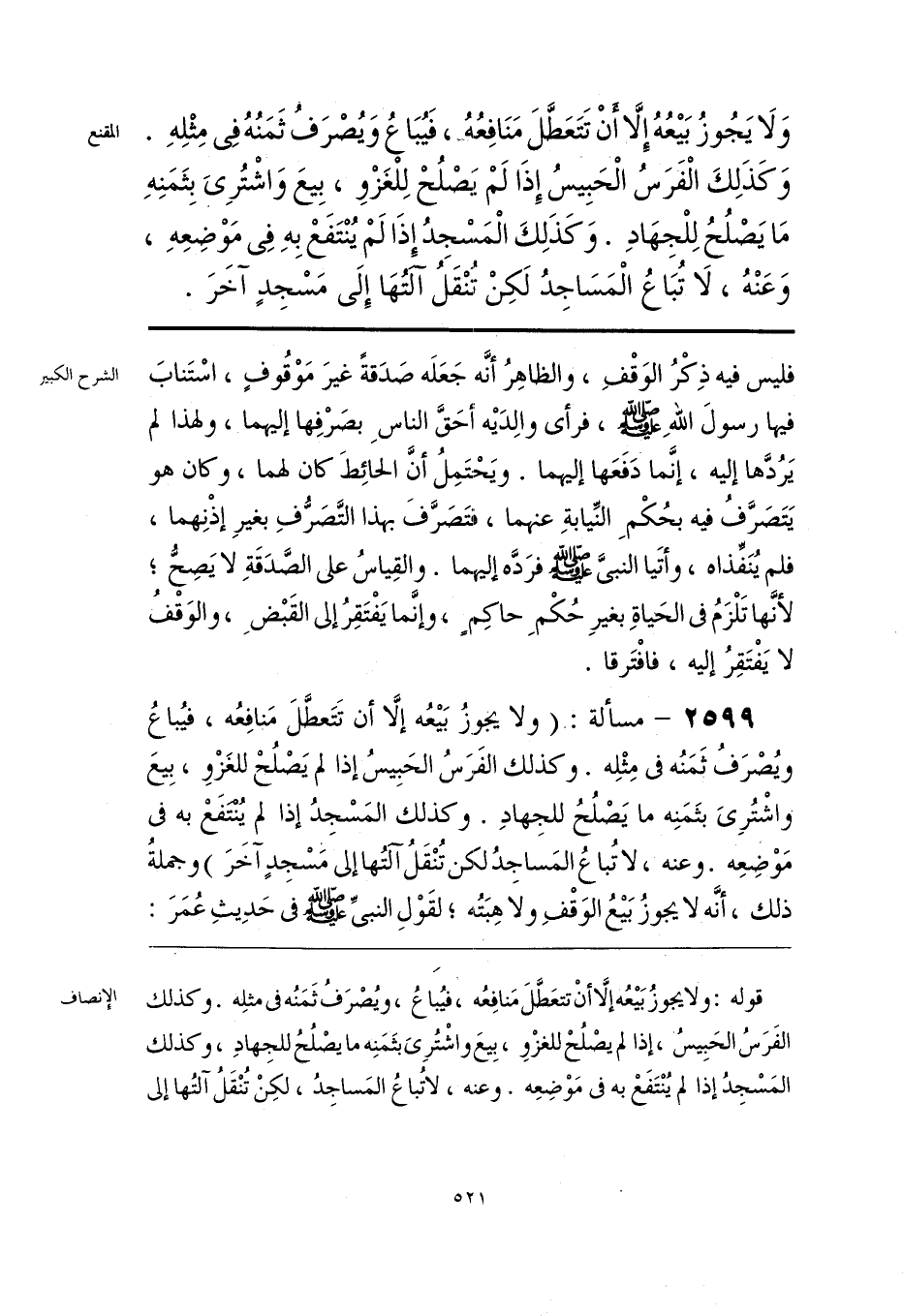 وَلَا يَجُوزُ بَيعُهُ إلا أنْ تَتَعَطَّلَ مَنَافِعُهُ، فَيُبَاعُ وَيُصْرَفُ ثَمَنُهُ في مِثْلِهِ. وَكَذَلِكَ الْفَرَسُ الْحَبِيسُ إِذَا لَمْ يصْلُحْ لِلْغَزْو، بِيعَ وَاشْتُرِىَ بِثَمَنِهِ مَا يَصْلُحُ لِلْجِهَادِ. وَكَذَلِكَ الْمَسْجِدُ إذَا لَمْ يُنْتَفَعْ بِهِ في مَوْضِعِهِ، وَعَنْهُ، لَا تُبَاعُ الْمَسَاجِدُ لَكِنْ تنْقَلُ آَلتُهَا إِلَى مَسْجِدٍ آخَرَ.
