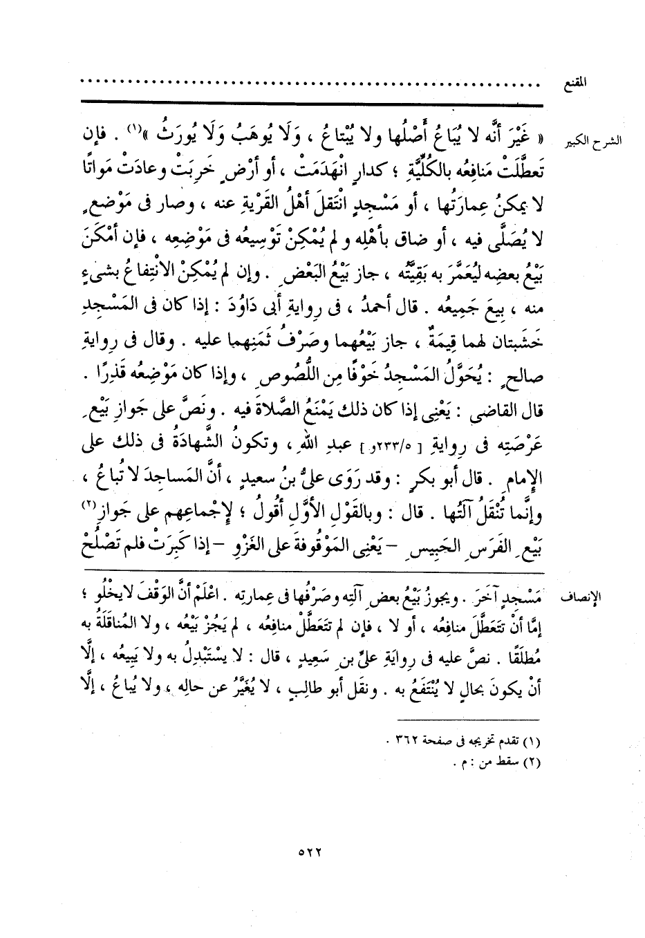 مَسْجِدٍ آخَرَ. ويجوزُ بَيعُ بعضِ آلتِه وصَرْفُها في عِمارتِه. اعْلَمْ أنَّ الوَقْفَ لا يَخْلُو؛ إمَّا أنْ تتَعَطَّلَ منافِعُه، أو لا، فإن لم تتَعَطَّلْ منافِعُه، لم يَجُزْ بَيعُه، ولا المُناقَلَةُ به مُطلَقًا. نصَّ عليه في رِوايَةِ علي بنِ سَعِيدٍ، قال: لا يسْتَبْدِلُ به ولا يَبِيعُه، إلَّا أنْ يكونَ بحالٍ لا يُنْتَفَعُ به. ونقَل أبو طالِبٍ، لا يُغيَّرُ عن حالِه، ولا يُباعُ، إلَّا
