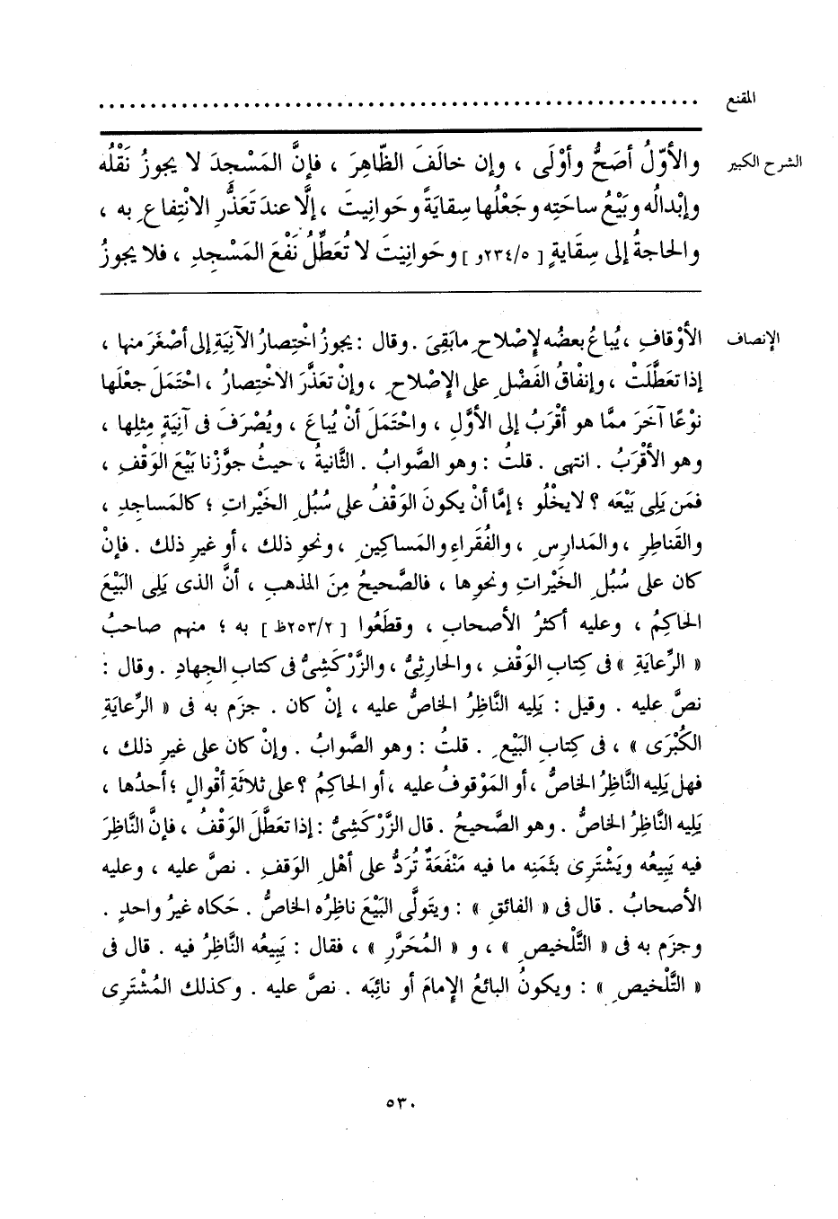 الأوْقافِ، يُباعُ بعضُه لإِصْلاحِ ما بَقِيَ. وقال: يجوزُ اخْتِصارُ الآنِيَةِ إلى أصْغَرَ منها، إذا تعَطَّلَتْ، وإنفْاقُ الفَضْلِ على الاصْلاحِ، وإنْ تعَذَّرَ الاخْتِصارُ، احْتَمَلَ جعْلَها نوْعًا آخَرَ مما هو أقْرَبُ إلى الأوَّلِ، واحْتَمَلَ أنْ يُباعَ، ويُصْرَفَ في آنِيَةٍ مِثلِها، وهو الأقْرَبُ. انتهى. قلتُ: وهو الصَّوابُ. الثَّانيةُ، حيثُ جوَّزْنا بَيعَ الوَقْفِ، فمَن يَلي بَيعَه؟ لا يخْلُو، إمَّا أنْ يكونَ الوَقْفُ علي سُبُلِ الخَيراتِ؛ كالمَساجِدِ، والقَناطِرِ، والمَدارِسِ، والفُقَراءِ والمَساكِينِ، ونحو ذلك، أو غيرِ ذلك. فإنْ كان على سُبُلِ الخَيراتِ ونحوها، فالصَّحيحُ مِنَ المذهبِ، أنَّ الَّذي يلي البَيعَ الحاكِمُ، وعليه أكْثرُ الأصحابِ، وقطَعُوا به؛ منهم صاحبُ «الرِّعايَةِ» في كِتابِ الوَقْفِ، والحارِثِيُّ، والزَّرْكَشِيُّ في كتابِ الجِهادِ. وقال: نصَّ عليه. وقيل: يَلِيه النَّاظِرُ الخاصُّ عليه، إنْ كان. جزَم به في «الرِّعايَةِ الكُبْرَى»، في كِتابِ البَيعِ. قلتُ: وهو الصَّوابُ. وإنْ كان على غيرِ ذلك، فهل يَلِيه النَّاظِرُ الخاصُّ، أو المَوْقوفُ عليه، أو الحاكِمُ؟ على ثلَاثَةِ أقْوالٍ؛ أحدُها، يَلِيه النَّاظِرُ الخاصُّ. وهو الصّحيحُ. قال الزَّرْكَشِي: إذا تعَطَّلَ الوَقْفُ، فإنّ النَّاظِرَ فيه يَبِيعُه ويَشْتَرِي بثَمَنِه ما فيه مَنْفَعَةٌ تُرَدُّ على أهْلِ الوَقفِ. نصَّ عليه، وعليه الأصحابُ. قال في «الفائقِ»: ويتَولَّى البَيعَ ناظِرُه الخاصُّ. حَكاه غيرُ واحدٍ. وجزَم به في «التَّلْخيصِ»، و «المُحَرّرِ»، فقال: يَبيعُه النَّاظِرُ فيه. قال في «التَّلْخيصِ»: ويكونُ البائعُ الإِمامَ أو نائِبَه. نصَّ عليه. وكذلك المُشْتَرِي