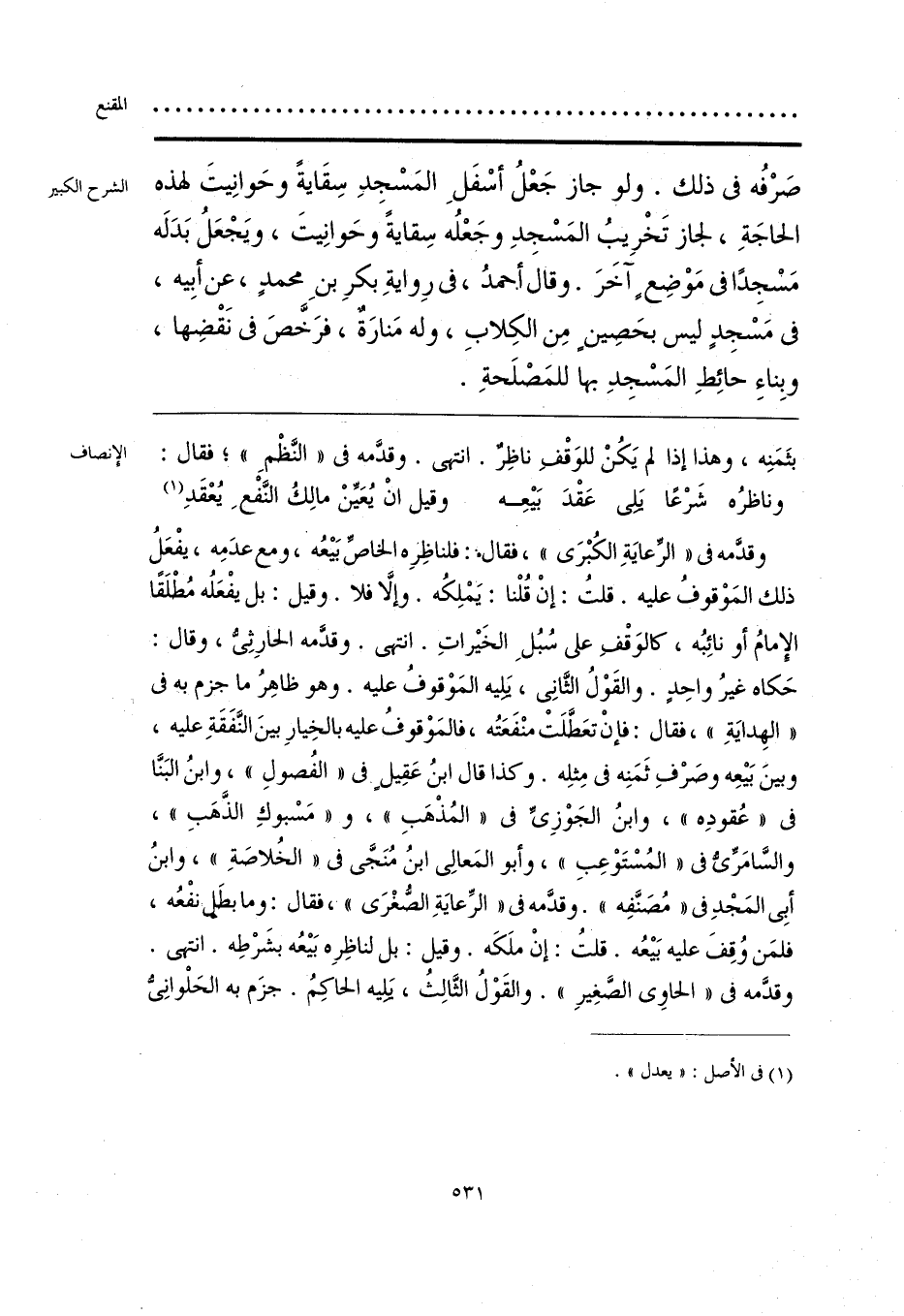 وقدَّمه في «الرِّعايَةِ الكُبْرَى»، فقال: فلناظِره الخاصِّ بَيعُه، ومع عدَمِه، يفْعَلُ ذلك المَوْقوفُ عليه. قلتُ: إنْ قُلْنا: يَمْلِكُه. وإلَّا فلا. وقيل: بل يفْعَلُه مُطْلَقًا الإمامُ أو نائِبُه، كالوَقْفِ على سُبُلِ الخَيراتِ. انتهى. وقدَّمه الحارِثِيُّ، وقال: حَكاه غيرُ واحِدٍ. والقَوْلُ الثَّانِي، يَلِيه المَوْقوفُ عليه. وهو ظاهِرُ ما جزم به في «الهِدايَةِ»، فقال: فإنْ تعَطَّلَتْ منْفَعَتُه، فالمَوْقوفُ عليه بالخِيارِ بينَ النَّفَقَةِ عليه، وبينَ بَيعِه وصَرْفِ ثَمَنِه في مِثلِه. وكذا قال ابنُ عَقِيلٍ في «الفُصولِ»، وابنُ البَنَّا في «عُقودِه»، وابنُ الجَوْزِي في «المُذْهَبِ»، و «مَسْبوكِ الذَّهَبِ»، والسَّامَريُّ في «المُسْتَوْعِبِ»، وأبو المَعالِي ابنُ مُنَجَّى في «الخُلاصَةِ»، وابنُ أبِي المَجْدِ في «مُصَنَّفِه». وقدَّمه في «الرِّعايَةِ الصُّغْرَى»، فقال: وما بطَل نفْعُه، فلمَن وُقِفَ عليه بَيعُه. قلتُ: إنْ ملَكَه. وقيل: بل لناظِرِه بَيعُه بشَرْطِه. انتهى. وقدّمه في «الحاوي الصَّغِيرِ». والقَوْلُ الثَّالِثُ، يَلِيه الحاكِمُ. جزَم به الحَلْوانِيُّ