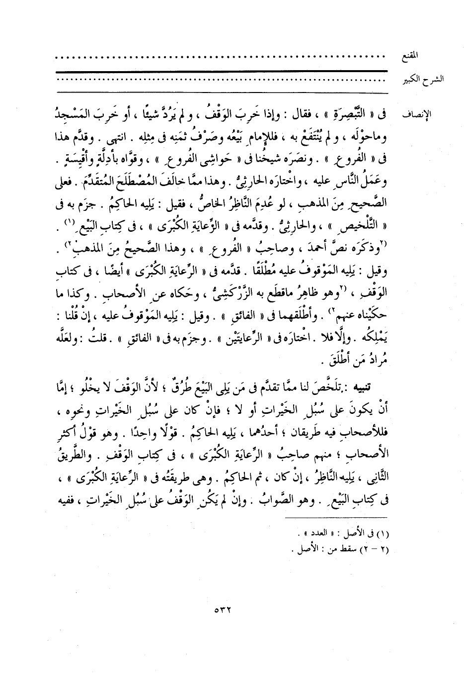 في «التَّبصِرَةِ»، فقال: وإذا خَرِبَ الوَقْفُ، ولم يَرُد شيئًا، أو خَرِبَ المَسْجِدُ وما حوْلَه، ولم يُنْتَفَعْ به، فللإِمامِ بَيعُه وصَرْفُ ثمَنِه في مِثلِه. انتهى. وقدَّم هذا في «الفُروعِ». ونصَرَه شيخُنا في «حَواشِي الفُروعِ»، وقوَّاه بأدِلَّةٍ وأقْيِسَةٍ. وعَمَلُ الناسِ عليه، واخْتارَه الحارِثِيُّ. وهذا ممَّا خالفَ المُصْطَلَحَ المُتقَدِّمَ. فعلى الصَّحيحِ مِنَ المذهبِ، لو عُدِمَ النَّاظِرُ الخاصُّ، فقيل: يَلِيه الحاكِمُ. جزَم به في «التَّلْخيصِ»، والحارِثِيُّ. وقدَّمه في «الرِّعايَةِ الكُبْرَى»، في كِتابِ البَيع. (¬1). [وذكَرَه نصَّ أحمدَ، وصاحبُ «الفُروع»، وهذا الصَّحيحُ منَ المذهب] (2). وقيل: يَلِيه المَوْقوفُ عليه مُطْلَقًا. قدَّمه في «الرِّعايَةِ الكُبْرَى» أيضًا، في كتابِ الوَقْفِ، [وهو ظاهِرُ ما قطَع به الزَّرْكَشِيُّ، وحَكاه عنِ الأصحابِ. وكذا ما حكَيناه عنهم] (¬2). وأطْلَقهما في «الفائقِ». وقيل: يَلِيه المَوْقوفُ عليه، إنْ قُلْنا: يَمْلِكُه. وإلَّا فلا. اخْتارَه في «الرِّعايتَين». وجزَم به في «الفائقِ». قلتُ: ولعَلَّه مُرادُ مَن أطْلَقَ.
