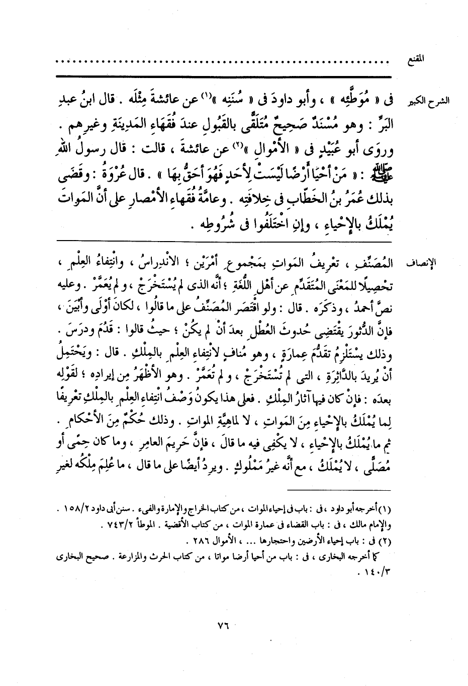 المُصَنِّفِ، تعْرِيفُ المَواتِ بمَجْموعِ أمْرَين؛ الانْدِراسُ، وانْتِفاءُ العِلْمِ، تحْصِيلًا للمَعْنَى المُتَقَدِّمِ عن أهْلِ اللغَةِ؛ أنَّه الذي لم يُسْتَخْرَجْ، ولم يُعَمَّرْ. وعليه نصَّ أحمدُ، وذكَرَه. قال: ولو اقْتَصَر المُصَنِّفُ على ما قالُوا، لكانَ أوْلَى وأبْيَنَ، فإنَّ الدُّثورَ يقْتَضِي حُدوثَ العُطْلِ بعدَ أنْ لم يكُنْ؛ حيثُ قالوا: قَدُمَ ودرَسَ. وذلك يسْتَلْزِمُ تقَدُّمَ عِمارَةٍ، وهو مُنافٍ لانْتِفاءِ العِلْمِ بالمِلْكِ. قال: ويَحْتَمِلُ أنْ يُريدَ بالدَّاثِرَةِ، التي لم تُسْتَخْرَجْ، ولم تُعَمَّرْ. وهو الأظْهَرُ مِن إيرادِه؛ لقَوْلِه بعدَه: فإنْ كان فيها آثارُ المِلْكِ. فعلى هذا يكونُ وَصْفُ انْتِفاءِ العِلْمِ بالمِلْكِ تعْرِيفًا لِما يُمْلَكُ بالإحْياءِ مِنَ المَواتِ، لا لماهِيَّةِ المواتِ. وذلك حُكْمٌ مِنَ الأحْكامِ. ثم ما يُمْلَكُ بالإِحْياءِ، لا يكْفِي فيه ما قال، فإنَّ حَرِيمَ العامِرِ، وما كان حِمًى أو مُصَلَّى، لا يُمْلَكُ، مع أنَّه غيرُ مَمْلُوكٍ. ويرِدُ أيضًا على ما قال، ما عُلِمَ مِلْكُه لغير