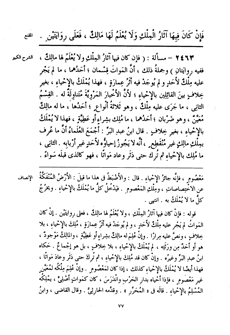 قوله: فإنْ كان فيها آثارُ المِلْكِ، ولا يُعْلَمُ لها مالِكٌ، فعلى رِوايتَين. إنْ كان المَواتُ لم يَجْرِ عليه مِلْكٌ لأحَدٍ، ولم يُوجَدْ فيه أثَرُ عِمارَةٍ، مُلِكَ بالإحْياءِ، بلا خِلافٍ، ونصَّ عليه مِرارًا. وإنْ عُلِمَ له مالِكٌ بشِراءٍ أو عَطِيَّةٍ، والمالِكُ مَوْجودٌ، هو أو أحَدٌ مِن ورَثَتِه، لم يُمْلَكْ بالإحْياءِ، بلا خِلافٍ، بل هو إجْماعٌ. حَكاه ابنُ عبدِ البَرِّ وغيرُه. وإنْ كان قد مُلِكَ بالإحْياءِ، ثم تُرِكَ حتى دَثَر وعادَ مَواتًا، فهذا أيضًا لا يُمْلَكُ بالإحْياءِ كذلك، إذا كان لمَعْصُومٍ. وإنْ عُلِمَ مِلْكُه لمُعَيَّنٍ غيرِ مَعْصومٍ، فإذا أحْياه بدارِ الحَرْبِ وانْدَرَسَ، كان كمَواتٍ أصْلِيٍّ، يمْلِكُه المُسْلِمُ بالإِحْياءِ. قاله في «المُحَرَّرِ». وقدَّمه الحارِثِيُّ. وقال القاضي، وابنُ