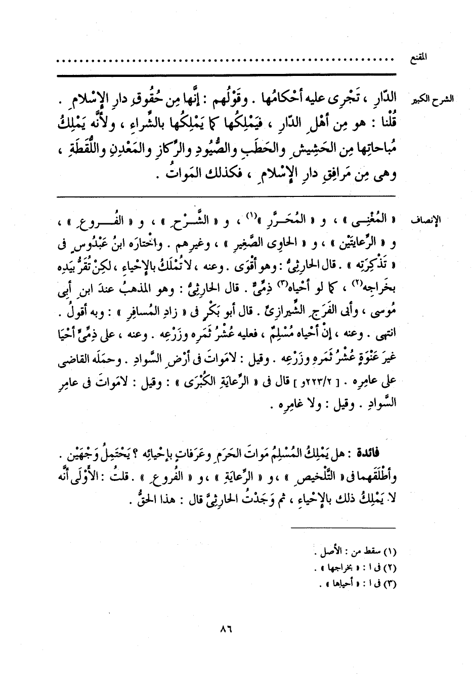 «المُغْنِي»، و «المُحَرَّرِ» (¬1)، و «الشرْحِ»، و «الفُروعِ»، و «الرِّعايتَين»، و «الحاوي الصَّغِيرِ»، وغيرِهم. واخْتارَه ابنُ عَبْدُوسٍ في «تَذْكِرَتِه». قال الحارِثِيُّ: وهو أَقْوَى. وعنه، لا تُمْلَكُ بالإحْياءِ، لكِنْ تُقَرُّ بيَدِه بخَراجِه (¬2)، كما لو أحْياه (¬3) ذِمِّيٌّ. قال الحارِثِيُّ: وهو المذهبُ عندَ ابنِ أبِي مُوسى، وأبي الفَرَجِ الشِّيرازِيِّ. قال أبو بَكْرٍ في «زادِ المُسافِرِ»: وبه أقولُ. انتهى. وعنه، إنْ أحْياه مُسْلِمٌ، فعليه عُشْرُ ثَمَرِه وزَرْعِه. وعنه، على ذِمِّيٍّ أحْيَا غيرَ عَنْوَةٍ عُشْرُ ثَمَرهِ وزَرْعِه. وقيل: لا مَواتَ في أرْضِ السَّوادِ. وحمَلَه القاضي على عامِرِه. قال في «الرِّعايَةِ الكُبْرَى»: وقيل: لا مَواتَ في عامِرِ السَّوادِ. وقيل: ولا غامِرِه.