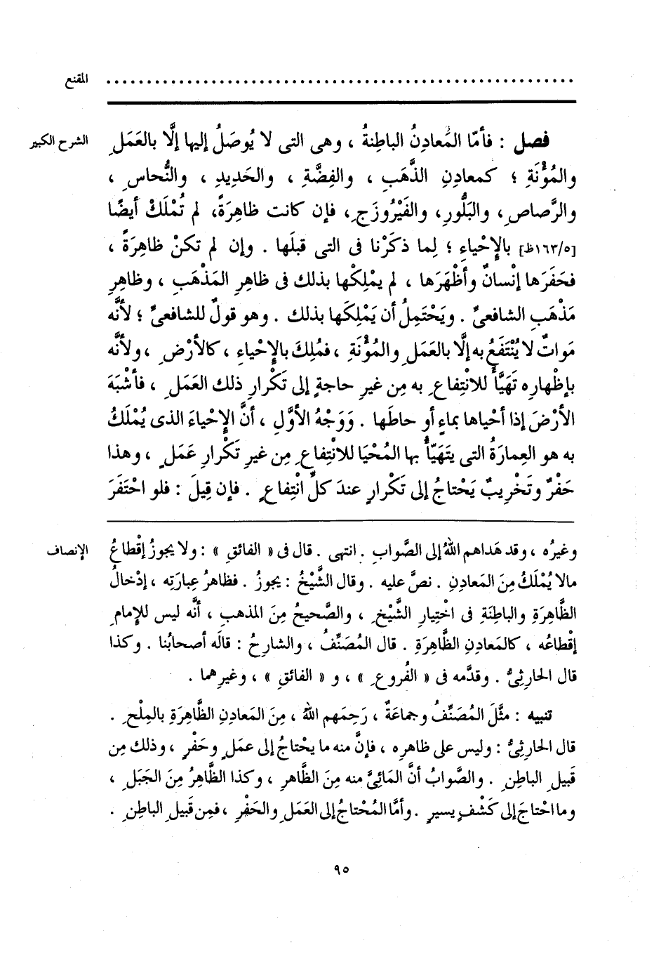 تنبيه: مثَّلَ المُصَنِّفُ وجماعَةٌ، رَحِمَهم اللهُ، مِنَ المَعادِنِ الظَّاهِرَةِ بالمِلْحِ. قال الحارِثِيُّ: وليس على ظاهرِه، فإنَّ منه ما يحْتاجُ إلى عمَلٍ وحَفْرٍ، وذلك مِن قَبيلِ الباطِنِ. والصَّوابُ أنَّ المَائِيَّ منه مِنَ الظَّاهرِ، وكذا الظَّاهِرُ مِنَ الجَبَلِ، وما احْتاجَ إلى كَشْفٍ يسيرٍ. وأمَّا المُحْتاجُ إلى العَمَلِ والحَفْرِ، فمِن قَبيلِ الباطِنِ.