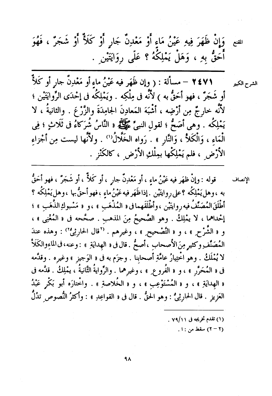 قوله: وإنْ ظهَر فيه عَينُ ماءٍ، أو مَعْدِنٌ جارٍ، أو كَلأٌ، أو شَجَرٌ، فهو أحَقُّ به، وهل يَمْلِكُه؟ على رِوايتَين. إذا ظَهَر فيه عَينُ ماءٍ، فهو أحقُّ بها، وهل يَمْلِكُه؟ أطْلَقَ المُصَنِّفُ فيه رِوايتَين، وأطْلَقَهما في «المُذْهَبِ»، و «مَسْبوكِ الذَّهَبِ»؛ إحْداهما، لا يمْلِكُ. وهو الصَّحيحُ مِنَ المذهبِ. صحَّحه في «المُغْنِي»، و «الشَّرْحِ»، و «التَّصْحيحِ»، وغيرِهم. [قال الحارِثِيُّ] (¬1): وهذه عندَ المُصَنِّفِ وكثيرٍ مِنَ الأصحابِ، أصحُّ. قال في «الهِدايَةِ»: وعنه، في الماءِ والكَلَأ لا يُمْلَكُ. وهو اخْتِيارُ عامَّةِ أصحابِنا. وجزَم به في «الوَجيزِ» وغيرِه. وقدَّمه في «المُحَرَّرِ»، و «الفُروعِ»، وغيرِهما. والرِّوايةُ الثَّانيةُ، يمْلِكُ. قدَّمه في «الهِدايَةِ»، و «المُسْتَوْعِبِ»، و «الخُلاصةِ». واخْتارَه أبو بَكْرٍ عَبْدُ العَزِيزِ. قال الحارِثِيُّ: وهو الحقُّ. قال في «القواعِدِ»: وأكثرُ النُّصوصِ تدُلُّ