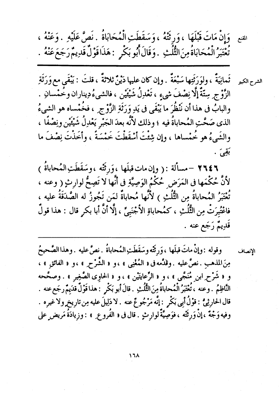 وقوله: وإنْ ماتَ قبلَها، وَرِثَتْه وسَقَطَتِ المُحاباةُ. نصَّ عليه. وهذا الصَّحيحُ مِنَ المذهبِ. نصَّ عليه. وقدَّمه في «المُغنِي»، و «الشَّرْحِ»، و «الفائقِ»، و «شَرْحِ ابنِ مُنَجَّى»، و «الرِّعايتَين»، و «الحاوي الصَّغِيرِ». وصححه النَّاظِمُ. وعنه، تُعْتَبَرُ الْمُحاباةُ مِنَ الثُّلُثِ. قال أبو بَكْرٍ: هذا قَوْلٌ قدَيِمٌ رجَع عنه. قال الحارِثِيُّ: قوْلُ أبِي بَكْرٍ: إنَّه مَرْجُوعٌ عنه. لا دَلِيلَ عليه مِن تارِيخٍ ولا غيرِه. وفيه وَجْهٌ، إنْ وَرِثَتْه، فوَصِيَّةٌ لوارِثٍ. قال في «الفُروعِ»: وزِيادَة مَريضٍ على