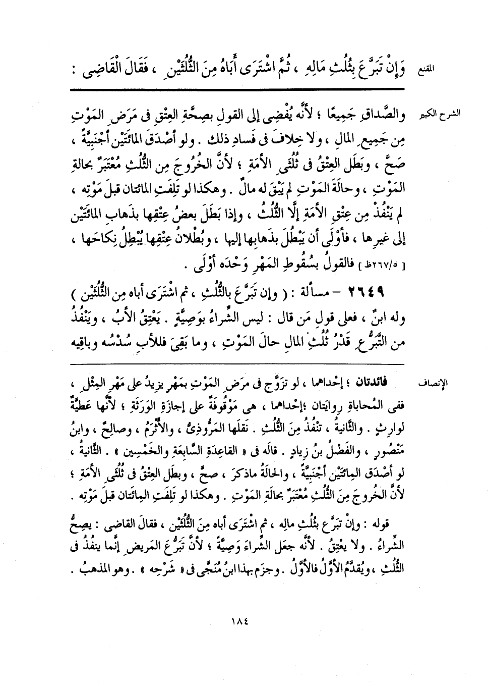 قوله: وإنْ تبَرَّع بثُلُثِ مالِه، ثم اشْتَرَى أباه مِنَ الثُّلُثَين، فقال القاضي: يصِحُّ الشراءُ. ولا يعْتِقُ. لأنه جعَل الشراءَ وَصِحةً؛ لأنَّ تَبَرُّعَ المَريضِ إنَّما ينفُذُ في الثُّلُثِ، ويُقدَّمُ الأوَّلُ فالأوَّلُ. وجزَم بهذا ابنُ مُنَجَّى في «شَرْحِه». وهو المذهبُ.