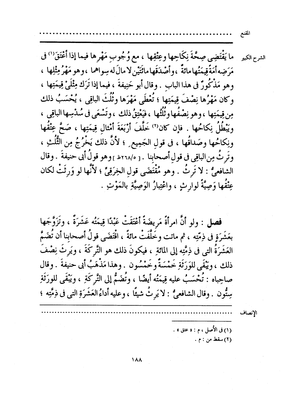 ما يَقْتَضِي صِحَّةَ نِكَاحِها وعِتْقِها، مع وُجُوبِ مَهْرِها فيما إذا أعْتَقَ (¬1) في مَرَضِه أمَةً قِيمَتُها مائة، وأصْدَقَها مائَتَين لا مال له سِواهما، وهو مَهْرُ مِثْلِها، وهو مَذْكُورٌ في هذا البابِ. وقال أبو حَنِيفةَ، فيما إذا تَرَك مِثْلَيْ قِيمَتِها، وكان مَهْرُها نِصْفَ قِيمَتِها؛ تُعْطَى مَهْرَها وثُلُثَ الباقِي، يُحْسَبُ ذلك مِن قِيمَتِها، وهو نِصْفُها وثُلُثُها، فيَعْتِقُ ذلك، وتَسْعَى في سُدْسِها الباقِي، ويَبْطُلُ نِكاحُها. فإن كان (¬2) خَلَّفَ أرْبَعَةَ أمْثالِ قِيمَتِها، صَحَّ عِتْقُها ونِكاحُها وصَداقُها، في قولِ الجَمِيعِ؛ لأنَّ ذلك يَخْرُجُ مِن الثُّلُثِ، وتَرِثُ مِن الباقِي في قولِ أصحابِنا وهو قولُ أبي حنيفةَ. وقال الشافعيُّ: لا تَرِث. وهو مُقْتَضَى قولِ الخِرَقِيِّ؛ لأنَّها لو وَرِثَتْ لكان عِتْقُها وَصِيَّةً لوارِثٍ، واعْتِبارُ الوَصِيَّةِ بالمَوْتِ.
