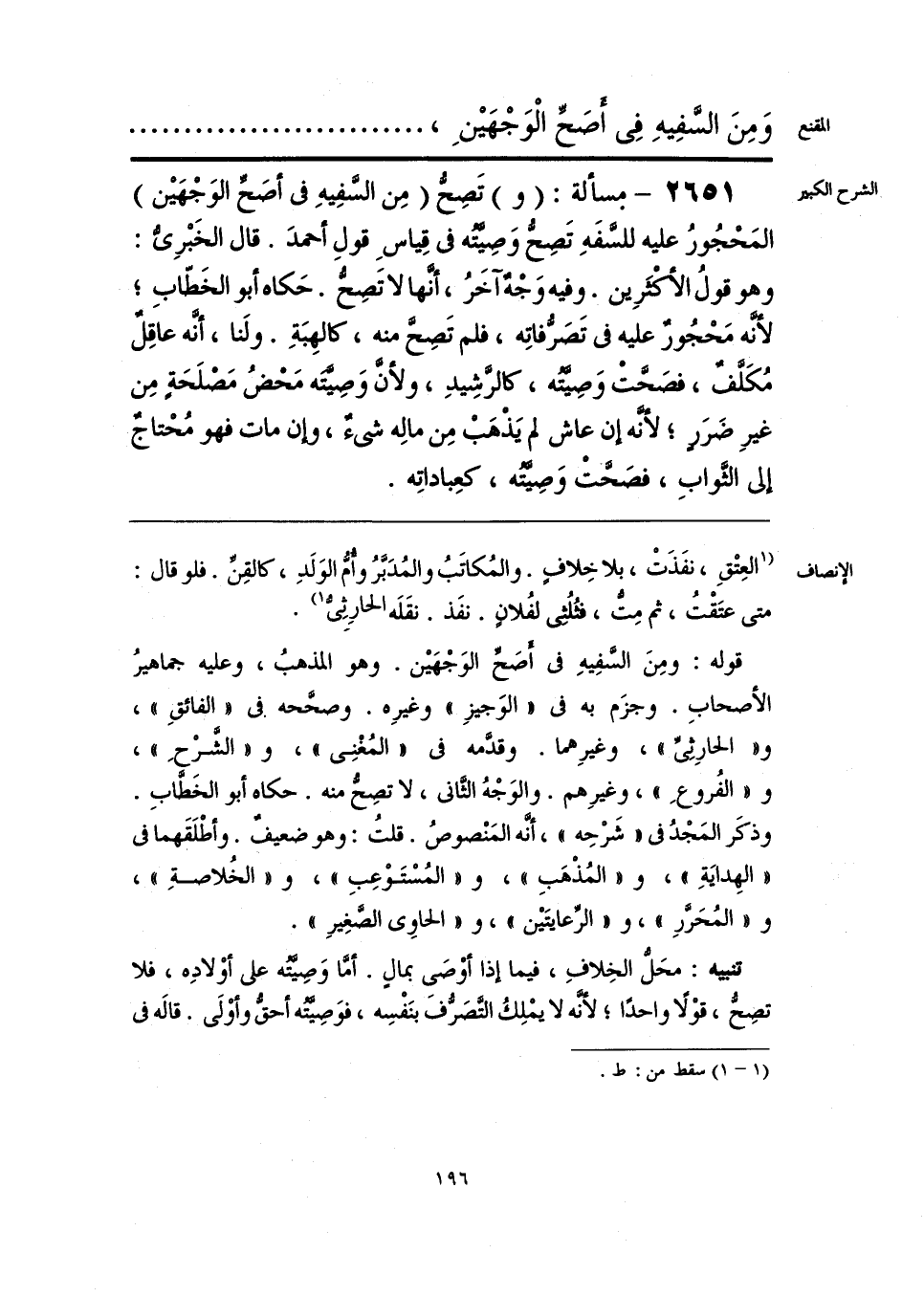 قوله: ومِنَ السفِيهِ في أصَحُّ الوَجْهَين. وهو المذهبُ، وعليه جماهيرُ الأصحابِ. وجزَم به في «الوَجيزِ» وغيرِه. وصحَّحه. في «الفائقِ»، و «الحارِثِيِّ»، وغيرِهما. وقدمه في «المُغْنِي»، و «الشَّرْحِ»، و «الفُروعِ»، وغيرِهم. والوَجْهُ الثاني، لا تصِحُّ منه. حكاه أبو الخَطَّابِ. وذكَر المَجْدُ في «شَرْحِه»، أنّه المَنْصوصُ. قلتُ: وهو ضعيف. وأطْلَقَهما في «الهِدايَةِ»، و «المُذْهَبِ»، و «المُسْتَوْعِبِ»، و «الخُلاصةِ»، و «المُحَرَّرِ»، و «الرِّعايتَين»، و «الحاوي الصَّغِيرِ».