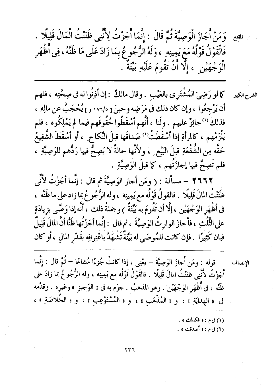 قوله: ومَن أجازَ الوَصِيَّةَ -يعْنِي، إذا كانتْ جُزءًا مُشاعًا- ثُمَّ قال: إنَّما أجَزْتُ لأننِي ظنَنْتُ المال قَلِيلًا. فالقَوْلُ قَوْلُه مع يَمِينه، وله الرُّجُوعُ بما زادَ على ظَنِّه، في أظْهَرِ الوَجْهَين. وهو المذهبُ. جزَم به في «الوَجيزِ» وغيرِه. وقدَّمه في «الهِدايَةِ»، و «المُذْهَبِ»، و «المُسْتَوْعِبِ»، و «الخُلاصَةِ»،