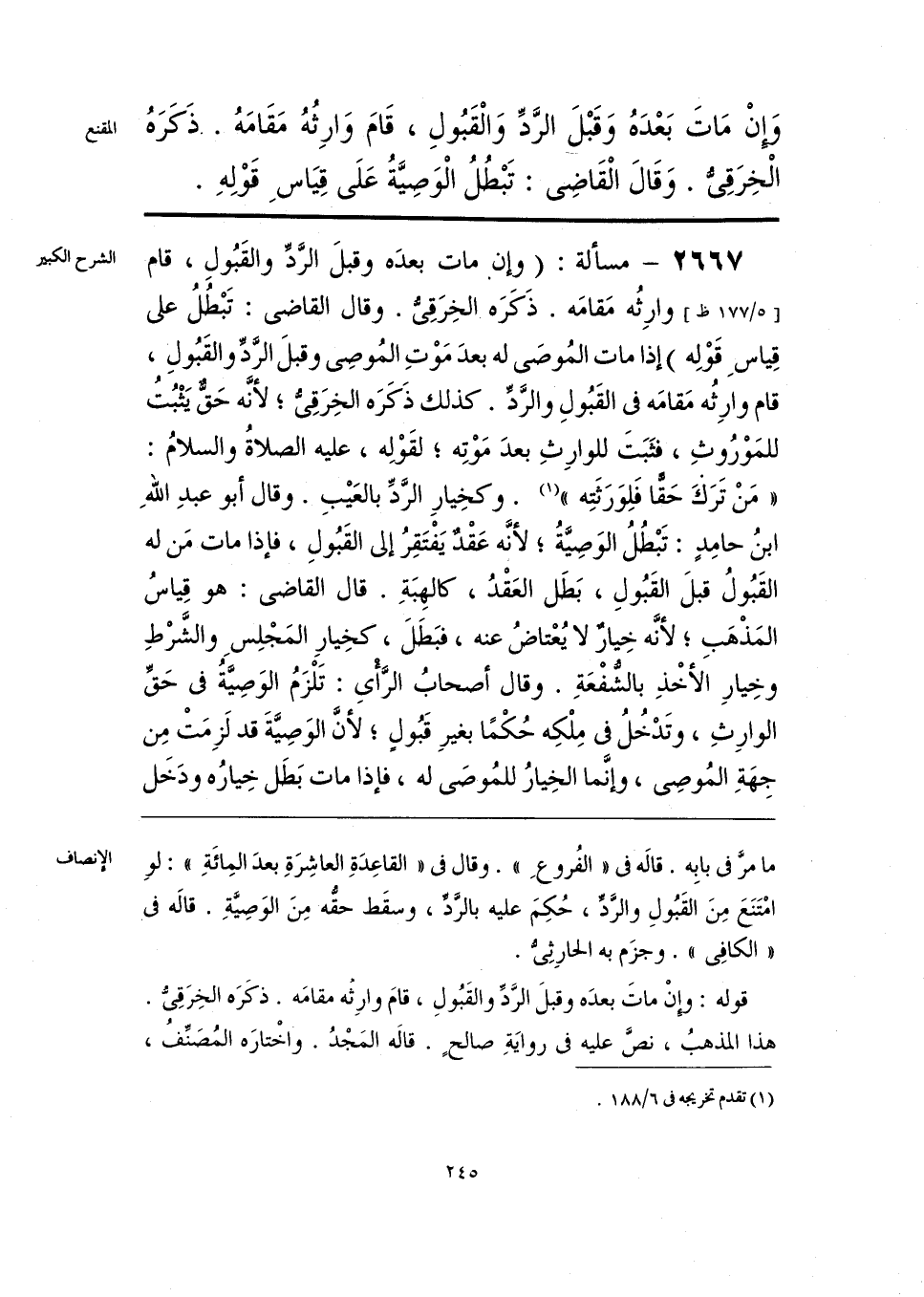 ما مرَّ في بابِه. قاله في «الفُروعِ». وقال في «القاعِدَةِ العاشِرَةِ بعدَ المِائَةِ»: لو امْتَنَعَ مِنَ القَبُولِ والرَّدِّ، حُكِمَ عليه بالرَّد، وسقَط حقُّه مِنَ الوَصِيَّةِ. قاله في «الكافِي». وجزَم به الحارِثِيُّ.
