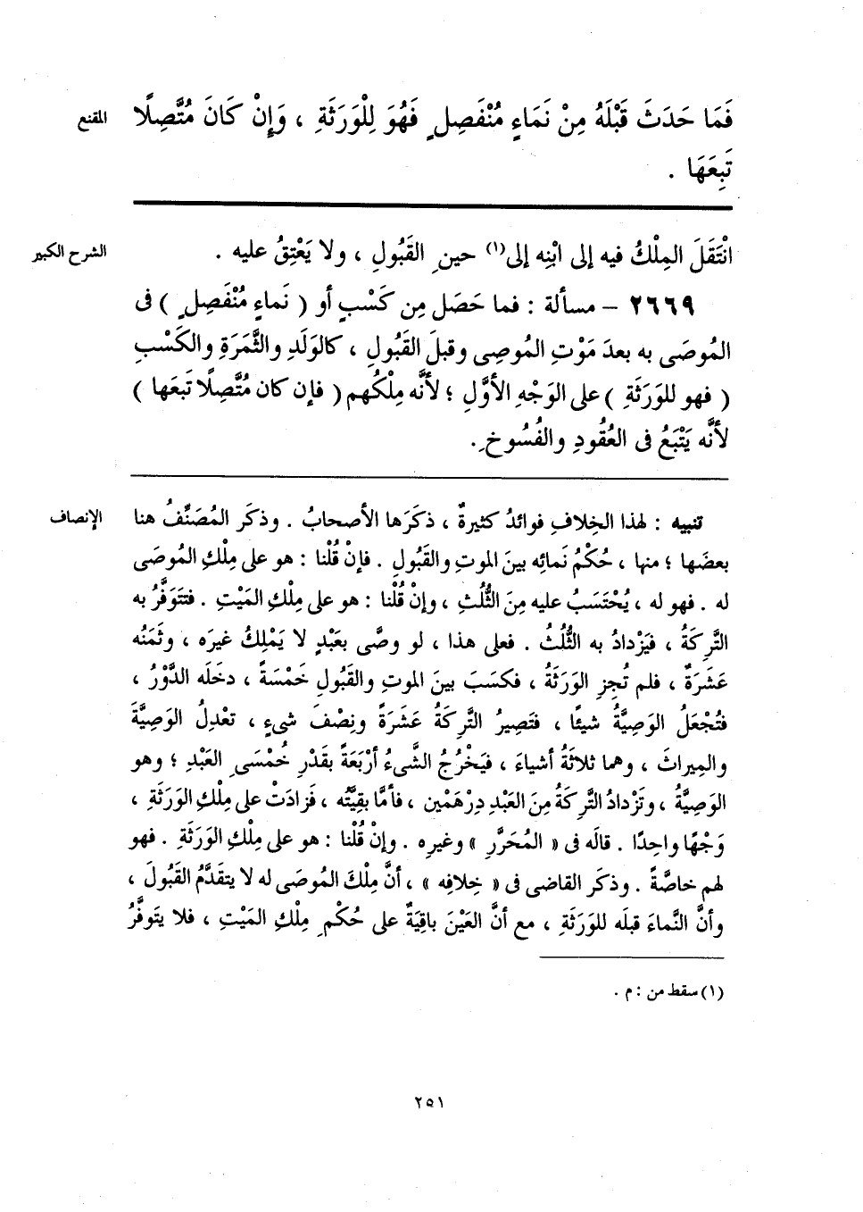 تنبيه: لهذا الخِلافِ فوائدُ كثيرةٌ، ذكَرَها الأصحابُ. وذكَر المُصَنِّفُ هنا بعضَها؛ منها، حُكْمُ نَمائِه بينَ الموتِ والقَبُولِ. فإنْ قُلْنا: هو على مِلْكِ المُوصَى له. فهو له، يُحْتَسَبُ عليه مِنَ الثُّلُثِ، وإنْ قُلْنا: هو على مِلْكِ المَيتِ. فتتَوَفَّرُ به التَّرِكَةُ، فيَزْدادُ به الثُّلُثُ. فعلى هذا، لو وصَّى بعَبْدٍ لا يَمْلِكُ غيرَه، وثَمَنُه عَشَرَةٌ، فلم تُجِزِ الوَرَثَةُ، فكسَبَ بينَ الموتِ والقَبُولِ خَمْسَةً، دخَلَه الدَّوْرُ، فتُجْعَلُ الوَصِيَّةُ شيئًا، فتَصِيرُ التَّرِكَةُ عَشَرَةً ونِصْفَ شيءٍ، تعْدِلُ الوَصِيَّةَ والمِيراثَ، وهما ثلاثةُ أشياءَ، فيَخْرُجُ الشَّيءُ أرْبَعَةً بقَدْرِ خُمْسَيِ العَبْدِ؛ وهو الوَصِيَّةُ، وتَزْدادُ الترِكَةُ مِنَ العَبْدِ دِرْهَمْين، فأمَّا بقِيَّتِه، فَزادَتْ على مِلْكِ الوَرَثَةِ، وَجْهًا واحِدًا. قاله في «المُحَررِ» وغيرِه. وإنْ قُلْنا: هو على مِلْكِ الوَرَثَةِ. فهو لهم خاصة. وذكَر القاضي في «خِلافِه»، أنَّ مِلْكَ المُوصَى له لا يتقَدَّمُ القَبُولَ، وأنَّ النَّماءَ قبلَه للوَرَثَةِ، مع أنَّ العَينَ باقِيَةٌ على حُكْمِ مِلْكِ المَيتِ، فلا يتَوفَّرُ