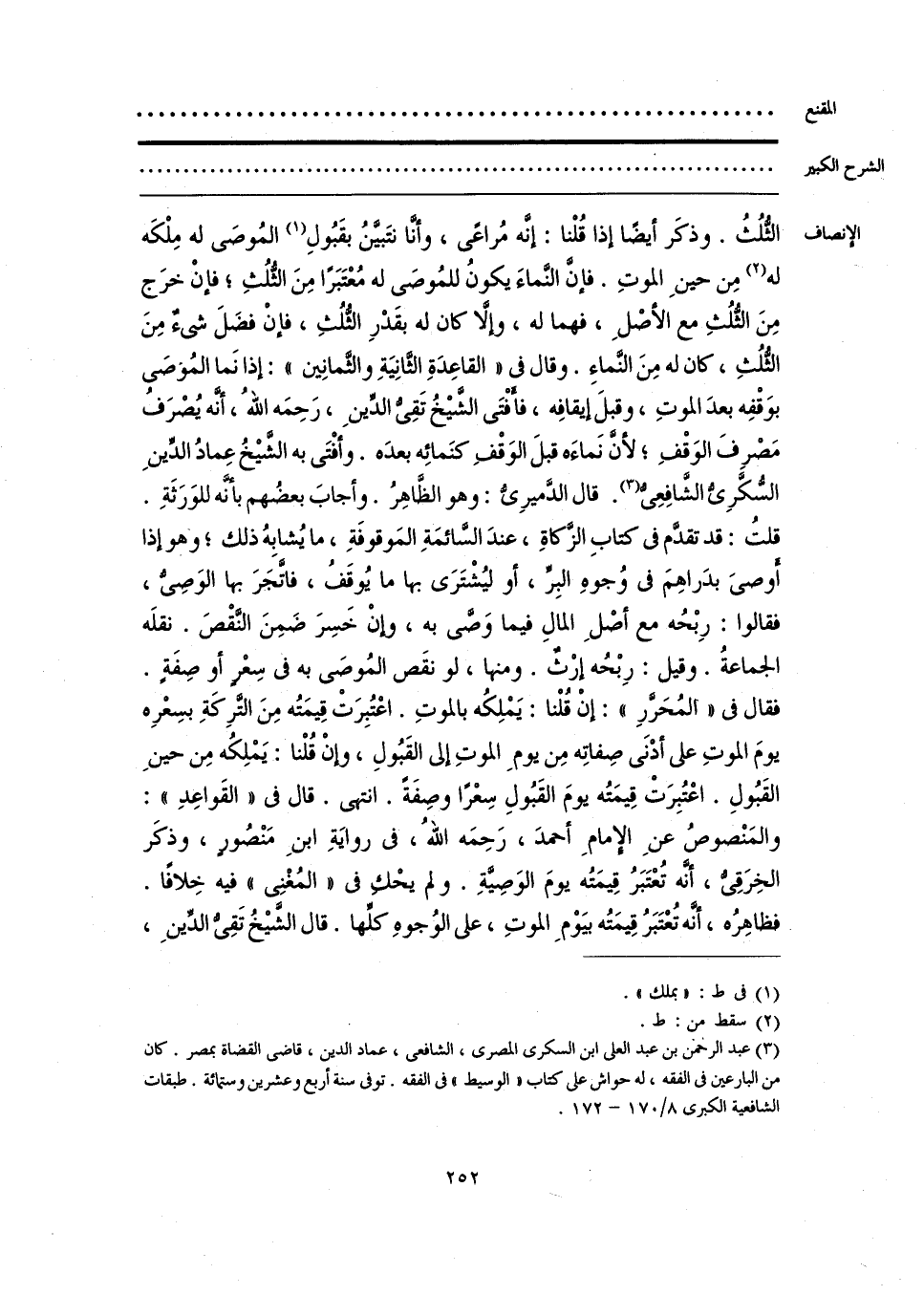 الثُّلُثُ. وذكَر أيضًا إذا تُلْنا: إنَّه مُراعًى، وأنَّا نتَبيَّنُ بقَبُولِ (¬1) المُوصَى له مِلْكَه له (¬2) مِن حينِ الموتِ. فإن النَّماءَ يكونُ للمُوصَى له مُعْتَبَرًا مِنَ الثُّلُثِ؛ فإنْ خرَج مِنَ الثُّلُثِ مع الأصْلِ، فهما له، وإلَّا كان له بقَدْرِ الثُّلُثِ، فإنْ فضَلَ شيءٌ مِنَ الثُّلُثِ، كان له مِنَ النَّماءِ. وقال في «القاعِدَةِ الثَّانِيَةِ والثَّمانِين»: إذا نَما المُوصَى بوَقْفِه بعدَ الموتِ، وقبلَ إيقافِه، فأفْتَى الشَّيخُ تَقِيُّ الدِّينِ، رَحِمَه اللهُ، أنَّه يُصْرَف مَصْرِفَ الوَقْفِ؛ لأن نَماءَه قبلَ الوَقْفِ كنَمائِه بعدَه. وأفْتَى به الشيخُ عِمادُ الدِّينِ السُّكَّرِيُّ الشَّافِعِيُّ (¬3). قال الدَّميرِيُّ: وهو الظَّاهِرُ. وأجابَ بعضُهم بأنَّه للوَرَثةِ. قلتُ: قد تقدَّم في كتابِ الزَّكاةِ، عندَ السَّائمَةِ المَوقوفَةِ، ما يُشابِهُ ذلك؛ وهو إذا أوصىَ بدَراهِمَ في وُجوهِ البِرِّ، أو ليُشْتَرَى بها ما يُوقَفُ، فاتَّجَرَ بها الوَصِيُّ، فقالوا: رِبْحُه مع أصْلِ المالِ فيما وَصَّى به، وإنْ خَسِرَ ضَمِنَ النَّقْصَ. نقلَه الجماعةُ. وقيل: رِبْحُه إرْثٌ. ومنها، لو نقَص المُوصَى به في سِعْرٍ أو صِفَةٍ. فقال في «المُحَررِ»: إنْ قُلْنا: يَمْلِكُه بالموتِ. اعْتُبِرَتْ قِيمَتُه مِنَ التَّرِكَةِ بسِعْرِه يومَ الموتِ على أدْنَى صِفاتِه مِن يومِ الموتِ إلى القَبُولِ، وإنْ قُلْنا: يَمْلِكُه مِن حينِ القَبُولِ. اعْتُبِرَتْ قِيمَتُه يومَ القَبُولِ سِعْرًا وصِفَةً. انتهى. قال في «القَواعِدِ»: والمَنْصوصُ عنِ الإِمامِ أحمدَ، رَحِمَه اللهُ، في روايَةِ ابنِ مَنْصُورٍ، وذكَر الخِرَقِيُّ، أنَّه تُعْتَبَرُ قِيمَتُه يومَ الوَصِيَّةِ. ولم يحْكِ في «المُغْنِي» فيه خِلافًا. فظاهِرُه، أنَّه تُعْتَبَرُ قِيمَتُه بيَوْمِ الموتِ، على الوُجوهِ كلِّها. قال الشيخُ تَقِيُّ الدِّينِ،