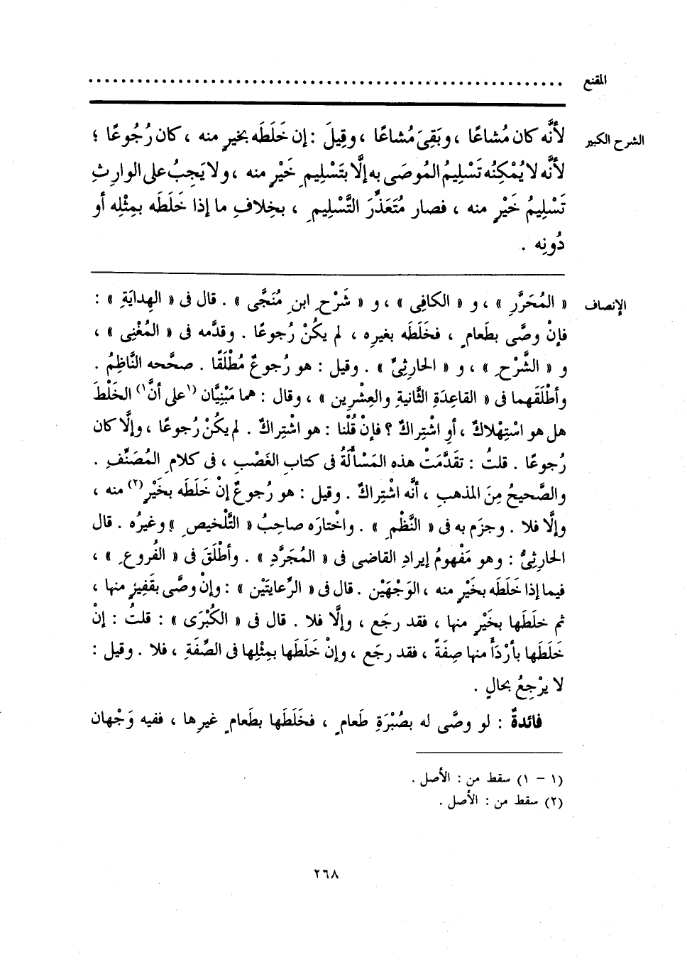 «المُحَرَّرِ»، و «الكافِي»، و «شَرْحِ ابنِ مُنَجَّى». قال في «الهِدايَةِ»: فإنْ وصَّى بطَعامٍ، فخَلَطَه بغيرِه، لم يكُنْ رُجوعًا. وقدَّمه في «المُغْنِي»، و «الشَّرْحِ»، و «الحارِثِيِّ». وقيل: هو رُجوعٌ مُطْلَقًا. صحَّحه النَّاظِمُ. وأطْلَقَهما في «القاعِدَةِ الثَّانيةِ والعِشْرِين»، وقال: هما مَبْنِيَّان [على أنَّ] (¬1) الخَلْطَ هل هو اسْتِهْلاكٌ، أو اشْتِراكٌ؟ فإنْ قُلْنا: هو اشْتِراكٌ. لم يكُنْ رُجوعًا، وإلَّا كان رُجوعًا. قلتُ: تقَدَّمَتْ هذه المَسْأَلةُ في كتابِ الغَصْبِ، في كلامِ المُصَنِّفِ. والصَّحيحُ مِنَ المذهبِ، أنَّه اشْتِراكٌ. وقيل: هو رُجوعٌ إنْ خَلَطَه بخَيرٍ (¬2) منه، وإلَّا فلا. وجزَم به في «النَّظْمِ». واخْتارَه صاحِبُ «التَّلْخيصِ» وغيرُه. قال الحارِثِيُّ: وهو مَفْهومُ إيرادِ القاضي في «المُجَرَّدِ». وأطْلَقَ في «الفُروعِ»، فيما إذا خَلَطَه بخَيرٍ منه، الوَجْهَين. قال في «الرِّعايتَين»: وإنْ وصَّى بقَفِيزٍ منها، ثم خلَطَها بخَيرٍ منها، فقد رجَع، وإلَّا فلا. قال في «الكُبْرَى»: قلتُ: إنْ خَلَطَها بأرْدَأَ منها صِفَةً، فقد رجَع، وإنْ خَلَطَها بمِثْلِها في الصِّفَةِ، فلا. وقيل: لا يرْجِعُ بحالٍ.