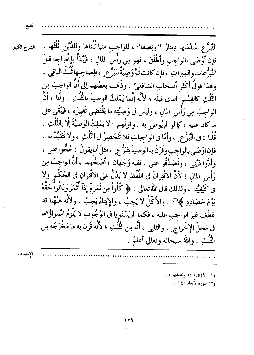 التَّبَرُّعِ سُدْسَها دِينارًا [ونِصفا] (¬1)، للواجبِ منها ثُلُثاها وللدَّينِ ثُلُثُها. فإن أوْصَى بالواجِبِ وأطْلَقَ، فهو مِن رأْسِ المالِ، فيُبْدأُ بإخْراجِه قبلَ التَّبَرُّعاتِ والمِيراثِ، فإن كانت ثَمَّ وَصِيَّةٌ بتَبَرُّع، فلِصاحِبِها ثُلُثُ الباقِي. وهذا قولُ أكْثَرِ أصحابِ الشافعيِّ. وذَهَب بعضُهم إلى أنَّ الواجِبَ مِن الثُّلُثِ كالقِسْمِ الذي قبلَه؛ لأنَّه إنَّما يَمْلِكُ الوصيةَ بالثُّلُثِ. ولَنا، أنَّ الواجِبَ مِن رَأْسِ المالِ، وليس في وَصِيَّتِه ما يَقْتَضِي تَغْيِيرَه، فيَبْقَى على ما كان عليه، كما لو لم يُوصِ به. وقولُهم: لا يَمْلِكُ الوَصِيَّةَ إلَّا بالثُّلُثِ. قُلْنا: في التَّبَرُّعِ، وأمّا في الواجِباتِ فلا تَنْحَصِرُ في الثُّلُثِ، ولا تَتَقَيَّدُ به. فإن أوْصَى بالواجِب وقَرَنَ به الوصيةَ بتَبَرُّعٍ، مثلَ أن يقولَ: حُجُّوا عني، وأدُّوا دَينِي، وتَصَدَّقُوا عني. ففيه وَجْهان؛ أصَحُّهما، أن الواجِبَ مِن رَأْسِ المالِ؛ لأنَّ الاقْتِرانَ في اللَّفْظِ لا يَدُلُّ على الاقْتِرانِ في الحُكْمِ ولا في كَيفِيَّتِه، ولذلك قال الله تعالى: {كُلُوا مِنْ ثَمَرِهِ إِذَا أَثْمَرَ وَآتُوا حَقَّهُ يَوْمَ حَصَادِهِ} (¬2). والأكْلُ لا يَجِبُ، والإِيتاءُ يَجِبُ. ولأنَّه ههُنا قد عَطَف غيرَ الواجِبِ عليه، فكما لم يَسْتَويا في الوُجُوبِ لا يَلْزَمُ اسْتواؤُهما في مَحَلِّ الإِخْراجِ. والثانِي، أنَّه مِن الثُّلُثِ؛ لأنَّه قَرَن به ما مَخْرَجُه مِن الثُّلُثِ. واللهُ سبحانه وتعالى أعلمُ.