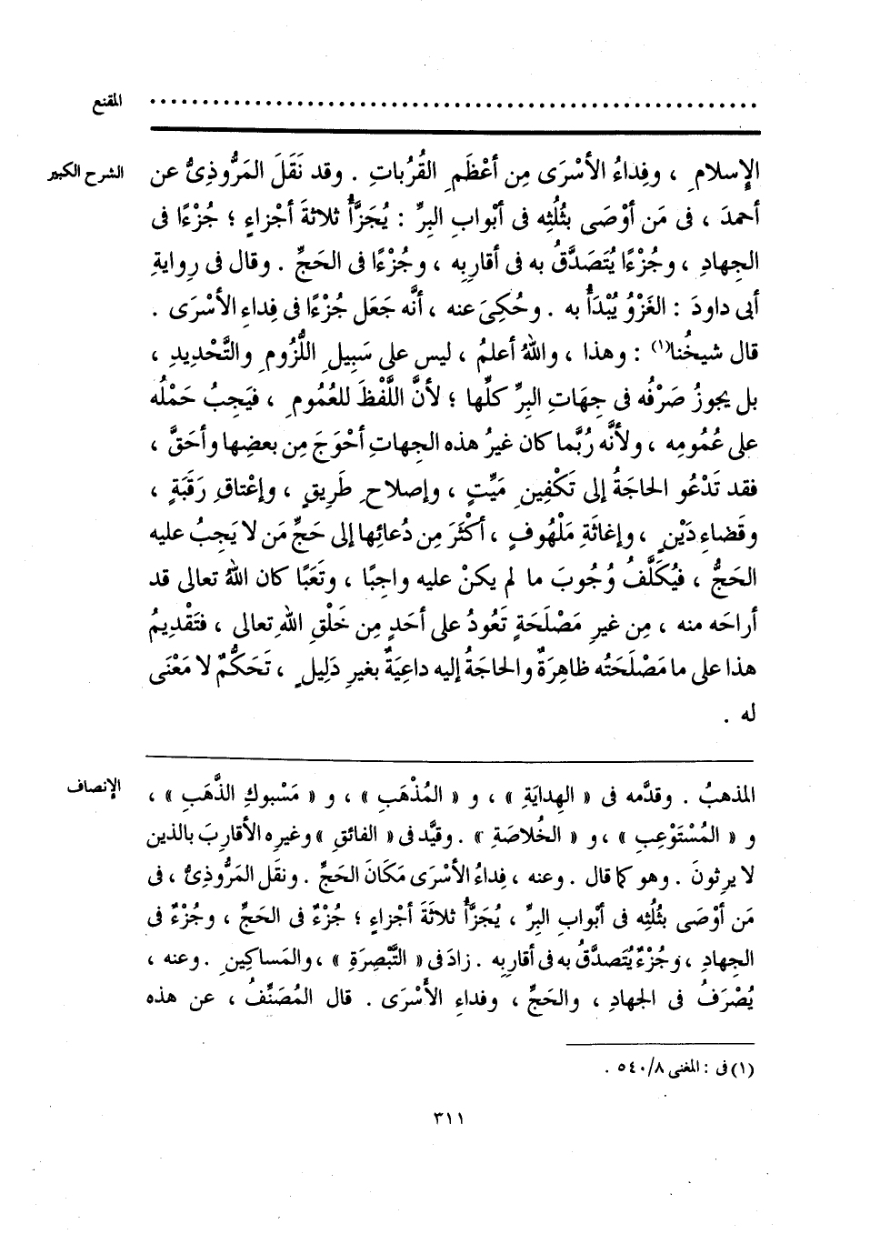 المذهبُ. وقدَّمه في «الهِدايَةِ»، و «المُذْهَبِ»، و «مَسْبوكِ الذَّهَبِ»، و «المُسْتَوْعِبِ»، و «الخُلاصَةِ». وقيَّد في «الفائقِ» وغيرِه الأقارِبَ بالذين لا يرِثونَ. وهو كما قال. وعنه، فِداءُ الأسْرَى مَكَانَ الحَجِّ. ونقَل المَرُّوذِيُّ، في مَن أوْصَى بثُلُثِه في أَبْوابِ البِرِّ، يُجَزَّأُ ثلَاثةَ أجْزاءٍ؛ جُزْءٌ في الحَجِّ، وجُزْءٌ في الجِهادِ، وجُزْءٌ يُتَصدَّقُ به في أقارِبِه. زادَ في «التَّبْصِرَةِ»، والمَساكِينِ. وعنه، يُصْرَفُ في الجهادِ، والحَجِّ، وفداءِ الأسْرَى. قال المُصَنِّفُ، عن هذه