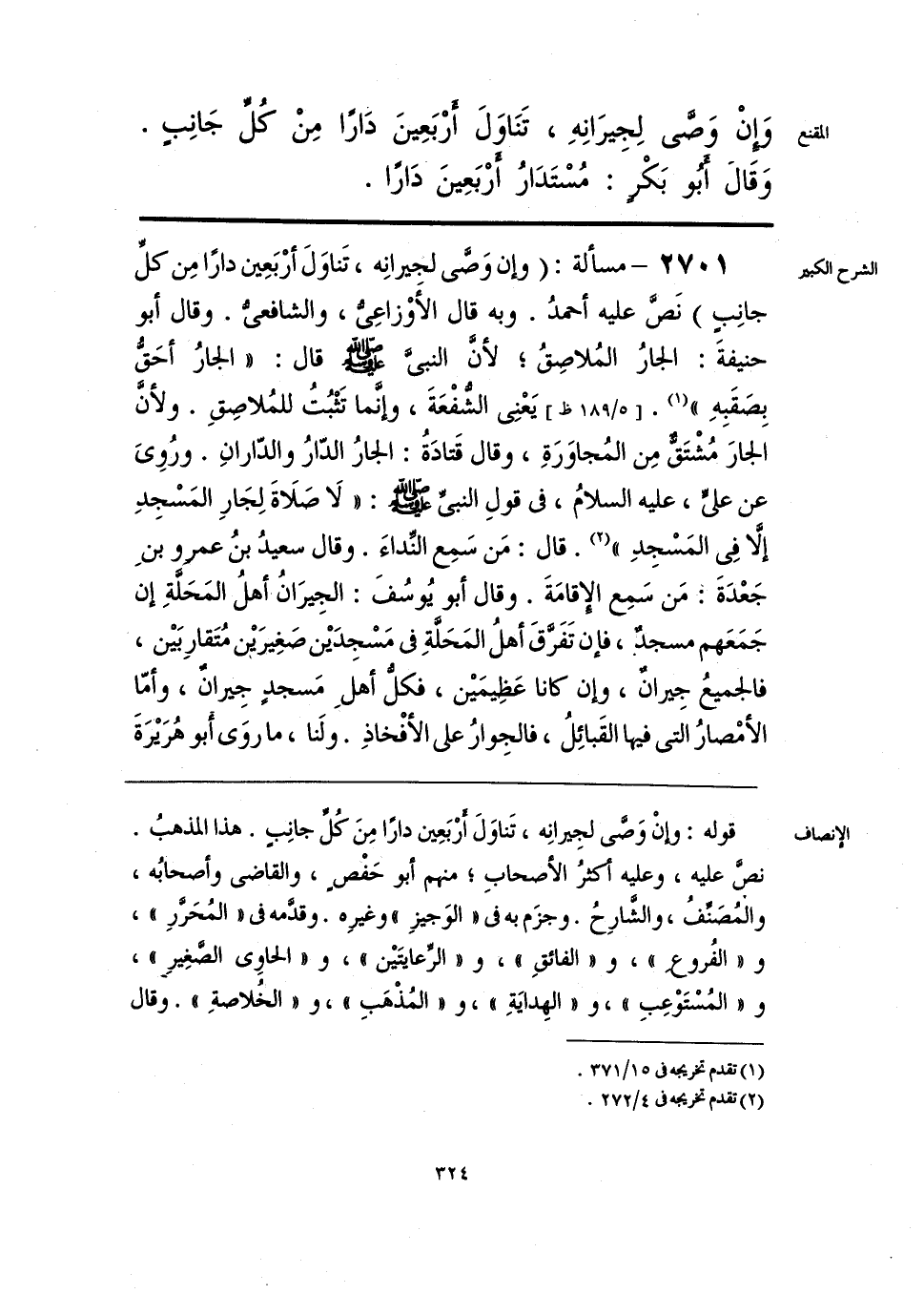 قوله: وإنْ وَصَّى لجِيرانِه، تَناوَلَ أرْبَعِين دارًا مِنَ كُل جانِبٍ. هذا المذهبُ. نصَّ عليه، وعليه أكثرُ الأصحابِ؛ منهم أبو حَفْصٍ، والقاضي وأصحابُه، والمُصَنِّفُ، والشَّارِحُ. وجزَم به في «الوَجيزِ» وغيرِه. وقدَّمه في «المُحَرَّرِ»، و «الفُروعِ»، و «الفائقِ»، و «الرِّعايتَين»، و «الحاوي الصَّغِير»، و «المُسْتَوْعِبِ»، و «الهِدايَةِ»، و «المُذْهَبِ»، و «الخُلاصةِ». وقال