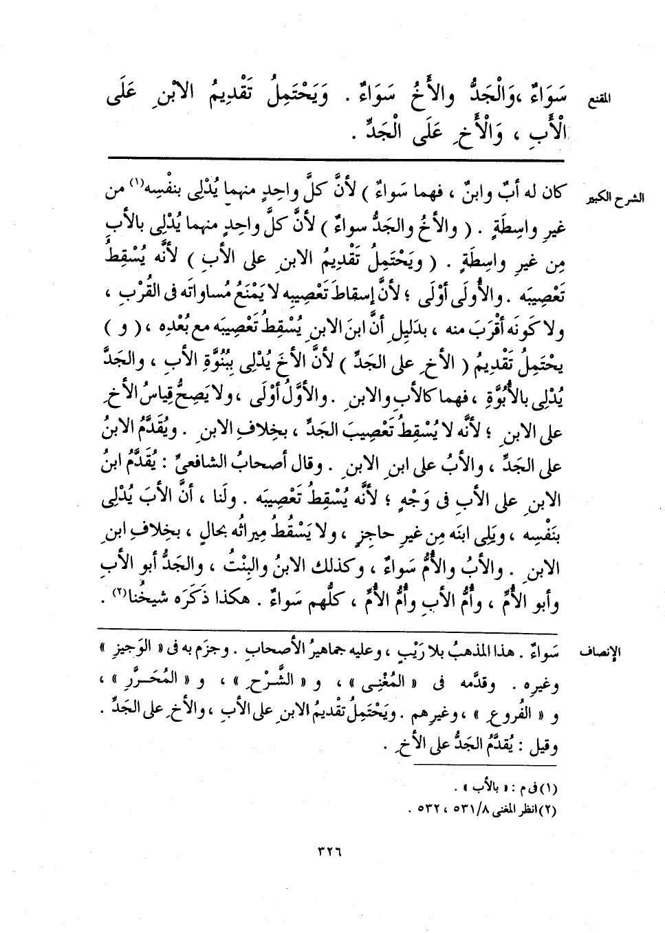 سَوَاءٌ، وَالْجَدُّ والأخُ سَوَاءٌ. وَيَحْتَمِلُ تَقْدِيمُ الابنِ عَلَى الْأَبِ، وَالْأَخِ عَلَى الْجَدِّ.