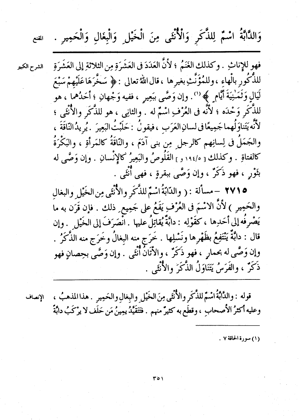 قوله: والدَّابةُ اسْمٌ للذَّكَرِ والأُنْثَى مِنَ الخَيلِ والبِغالِ والحَمِيرِ. هذا المذهبُ، وعليه أكثرُ الأصحابِ، وقطَع به كثيرٌ منهم. فتَتَقَيَّدُ يمِينُ مَن حَلَف لا يرْكَبُ دابَّةً