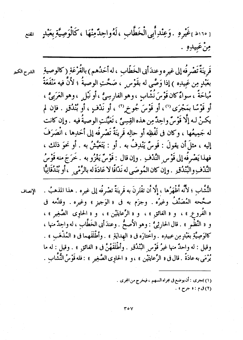 النُّشَّابِ؛ لأنَّه أظْهَرُها, إلَّا أن تقْتَرِنَ به قَرِينةٌ تصْرِفُه إلى غيرِه. هذا المذهبُ. صحَّحه المُصَنِّفُ وغيرُه. وجزَم به في «الوَجيزِ» وغيرِه. وقدَّمه في «الفُروعِ»، و «الفائقِ»، و «الرِّعايتَين»، و «الحاوي الصَّغِيرِ»، و «النَّظْمِ». قال الحارِثِيُّ: وهو الأصحُّ. وعندَ أبي الخَطَّابِ، له واحِدٌ منها، كالوَصِيُّةِ بعَبْدٍ مِن عبيدِه. واخْتارَه في «الهِدايَةِ». وأطْلَقَهما في «المُذْهَبِ». وقيل: له واحدٌ منها غيرُ قَوْسِ البُنْدُقِ. وأطْلَقَهُنَّ في «الفائقِ». وقيل: له ما يُرْمَى به عادَةً. قال في «الرِّعايتَين»، و «الحاوي الصَّغِيرِ»: فله قَوْسُ النُّشَّابِ.