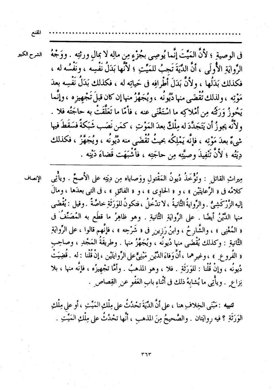 مِيراثِ القاتلِ: وتُؤْخَذُ دُيونُ المَقْتولِ ووَصاياه مِن دِيَتِه على الأصحِّ. ويأْتِي كلامُه في «الرِّعايتَين»، و «الحاوي»، و «الفائقِ»، في التي بعدَها، ومال إليه الزَّرْكَشِيُّ. والرِّوايةُ الثَّانيةُ، لا تدْخُلُ، فتكونُ للوَرَثَةِ خاصَّةً. وقيل: يُقْضَى منها الدَّينُ أَيضًا. على الرِّوايَةِ الثَّانيةِ. وهو ظاهِرُ ما قطَع به المُصَنِّفُ في «المُغْنِي»، والشَّارِحُ، وابنُ رَزِينٍ في «شَرْحِه»، فإنَّهم قالوا، على الرِّوايَةِ الثَّانيةِ: وكذلك يُقْضَى منها دُيونُه، ويُجَهَّزُ منها. وطريقَةُ المَجْدِ، وصاحِبِ «الفُروعِ»، وغيرِهما، أنَّ وَفاءَ الدَّينِ مَبْنِيٌّ على الرِّوايتَين، إنْ قُلْنا: له. قُضِيَتْ دُيونُه، وإنْ قُلْنا: للوَرَثَةِ. فلا، وهو المذهبُ. وأمَّا تجْهِيزُه، فإنَّه منها، بلا نِزاعٍ. ويأْتِي ما يُشابِهُ ذلك في أثْناءِ بابِ العَفْو عنِ القِصاصِ.