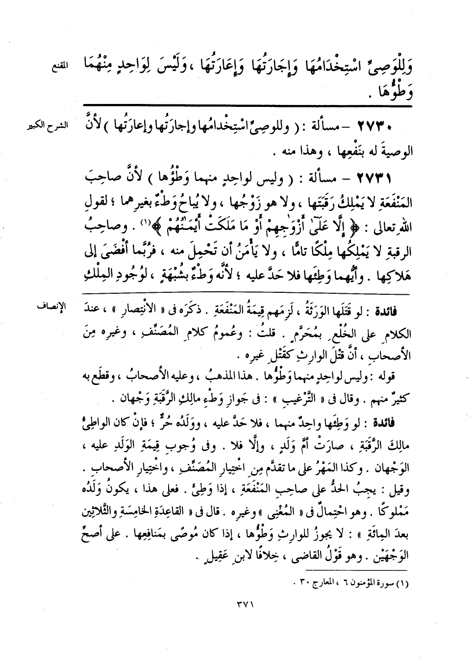 فائدة: لو وَطِئَها واحِدٌ منهما، فلا حَدَّ عليه، ووَلَدُه حُرٌّ؛ فإنْ كان الواطِئ مالِكَ الرَّقَبَةِ، صارَتْ أم وَلَدٍ، وإلَّا فلا. وفي وُجوبِ قِيمَةِ الوَلَدِ عليه، الوَجْهان. وكذا المَهْرُ على ما تقدَّم مِنِ اخْتِيارِ المُصَنِّفِ، واخْتِيارِ الأصحابِ. وقيل: يجِبُ الحدُّ على صاحِبِ المَنْفَعَةِ، إذا وَطِئ. فعلى هذا، يكونُ وَلَدُه مَمْلوكًا. وهو احْتِمالٌ في «المُغْنِي» وغيرِه. قال في «القاعِدَةِ الخامِسَةِ والثَّلاثين بعدَ المِائَةِ»: لا يجوزُ للوارِثِ وَطْؤها، إذا كان مُوصًى بمَنافِعِها. على أصحِّ الوَجْهَين. وهو قَوْلُ القاضي، خِلافًا لابنِ عَقِيلٍ.
