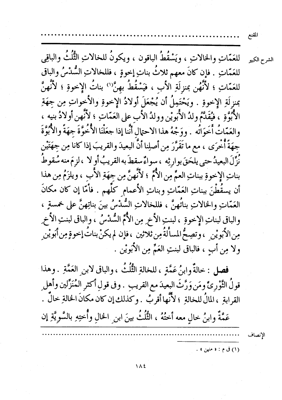 للعَمّاتِ والخالاتِ، ويَسْقُطُ الباقون، ويكونُ للخالاتِ الثُّلُثُ والباقِي للعَمّاتِ. فإن كانَ معهم ثلاثُ بناتِ إخوةٍ، فللخالاتِ السُّدْسُ والباقي للعَمّاتِ؛ لأنَّهُن بمنزِلَة الأبِ، فيَسْقُطُ بهِنَّ (¬1) بناتُ الإِخوةِ؛ لأنَّهنَّ بمنزِلَةِ الإِخوةِ. ويَحْتَمِلُ أن يُجْعَلَ أولادُ الإِخوةِ والأخواتِ مِن جِهَةِ الأُبُوَّةِ، فيُقَدَّمُ ولدُ الأبَوين وولدُ الأبِ على العَمّاتِ؛ لأنَّهن أولادُ بنيه، والعَمّاتُ أَخَوَاتُه. ووَجْهُ هذا الاحتمال أنَّنا إذا جعَلْنَا الأُخُوَّةَ جِهَةً والأُبُوَّةَ جهَةً أُخْرَى، مع ما تَقَرَّرَ مِن أصلِنا أَنَّ البعيدَ والقريبَ إذا كانا مِن جِهَتَينِ نُزِّلَ البعيدُ حتَّى يلحَقَ بوارِثِه، سواءٌ سقطَ به القريبُ أو لا، لزِمَ منه سُقوطُ بناتِ الإِخوةِ ببناتِ العمِّ مِن الأُمِّ؛ لأنَّهنَّ مِن جِهَةِ الأَب، ويلزَمُ مِن هذا أن يسقُطْنَ ببناتِ العَمّاتِ وبناتِ الأعمامِ كلِّهم. فأمَّا إن كان مكانَ العَمّاتِ والخالاتِ بناتُهنَّ، فللخالاتِ السُّدْسُ بينَ بناتِهنَّ على خمسةٍ، والباقي لبناتِ الإِخوةِ، لبنتِ الأخِ مِن الأُمِّ السُّدْسُ، والباقي لبنتِ الأخِ مِن الْأَبَوَينِ، وتصِحُّ المسألةُ مِن ثلاثين، فإن لم يكنْ بناتُ إخوةٍ مِن أَبَوينِ ولا مِن أبٍ، فالباقي لبنتِ العَمِّ مِن الْأَبَوَينِ.