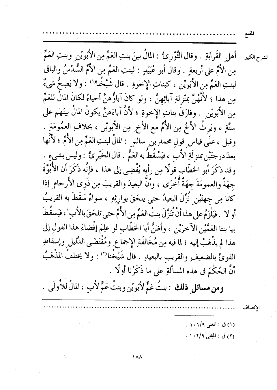 أهلِ القَرابَةِ. وقال الثَّوْرِيُّ: المالُ بينَ بنتِ العَمِّ مِن الأبوينِ وبنتِ العَمِّ مِن الأُمِّ على أربعةٍ. وقال أبو عُبَيدٍ: لبنتِ العَمِّ مِن الأُمِّ السُّدْسُ والباقي لبنتِ العَمِّ مِن الأبوين، كبناتِ الإِخوةِ. قال شَيخُنا (¬1): ولا يَصِحُّ شيءٌ مِن هذا؛ لأنَّهُنَّ بمنْزِلَةِ آبائِهِنَّ، ولو كانَ آباوهنَّ أحياءً لكانَ المالُ للعَمِّ مِن الأَبَوينِ. وفارَقَ بناتِ الإِخوةِ؛ لأنَّ آباءَهنَّ يكونُ المالُ بينَهم على ستَّةٍ، ويَرِثُ الأخُ مِن الأُمِّ مع الأخَ مِن الأَبَوين، بخلافِ العمُومَةِ. وقيل، علَى قياسِ قولِ محمدِ بنِ سالم: المالُ لبنتِ العَمِّ مِن الأُمِّ؛ لأنَّها بعدَ درجتَين بمنزِلَةِ الأبِ، فيَسْقُطُ به العَمُّ. قال الخَبْرِيُّ: وليس بشيءٍ. وقد ذكَرَ أبو الخطّاب قولًا مِن رأيه يُفْضِي إلى هذا، فإنَّه ذَكَرَ أن الأُبُوَّةَ جِهَةٌ والعمومَةَ جِهَةٌ أُخرَى، وأنَّ البعيدَ والقريبَ مِن ذَوي الأرحامِ إذا كانا مِن جِهتَينِ نُزِّلَ البعيدُ حتَّى يلحَقَ بوارِثِهِ، سواءٌ سَقَطَ به القريبُ أو لا. فيَلْزَمُ على هذا أنْ تُنَزَّلَ بنتُ العَمِّ مِن الأُمِّ حتَّى تلحَقَ بالأبِ، فيَسقُطَ بها بنتا العَمَّين الآخرَين، وأظنُّ أبا الخطّابِ لو علِمَ إفْضاءَ هذا القولِ إلى هذا لم يذْهَبْ إليه، لما فيه مِن مُخَالفَةِ الإِجماعِ ومُقْتَضَى الدَّليلِ وإسقاطِ القويِّ بالضعيفِ والقريبِ بالبعيدِ. قال شَيخُنا (¬2): ولا يختلفُ المذْهَبُ أنَّ الحُكْمَ في هذه المسألةِ على ما ذَكَرْنا أولًا.